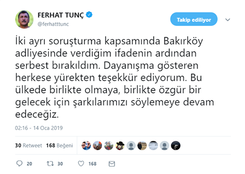 Tunç, “Güzel şeyler söyleyemeyecek bir durumdayız. Bugün serbest bırakıldım ama yarın tutuklayabilirler. Kimse özgür değil. Cezaevinde yıllarımı da geçirsem bu ülkeyi terk etmeyeceğim.” dedi. (HABER MERKEZİ)
