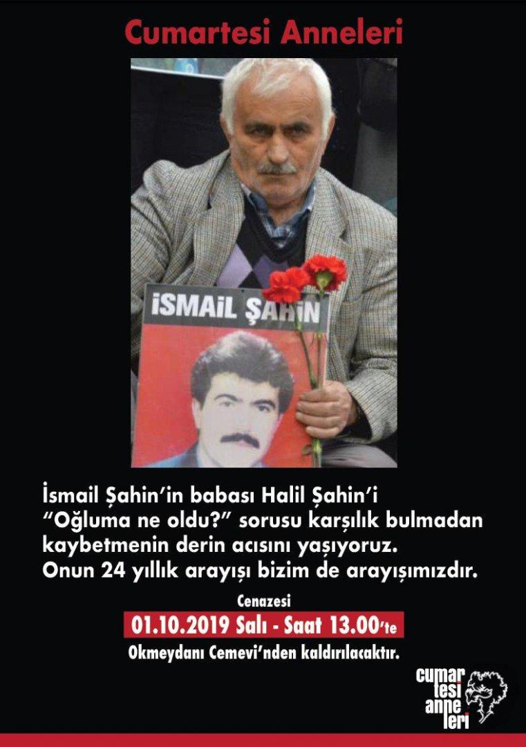Bir açıklama yapan Cumartesi Anneleri, “İsmail Şahin’in babası Halil Şahin’i “Oğluma ne oldu?” sorusu karşılık bulmadan kaybetmenin derin acısını yaşıyoruz. Onun 24 yıllık arayışı bizim de arayışımızdır” dedi.