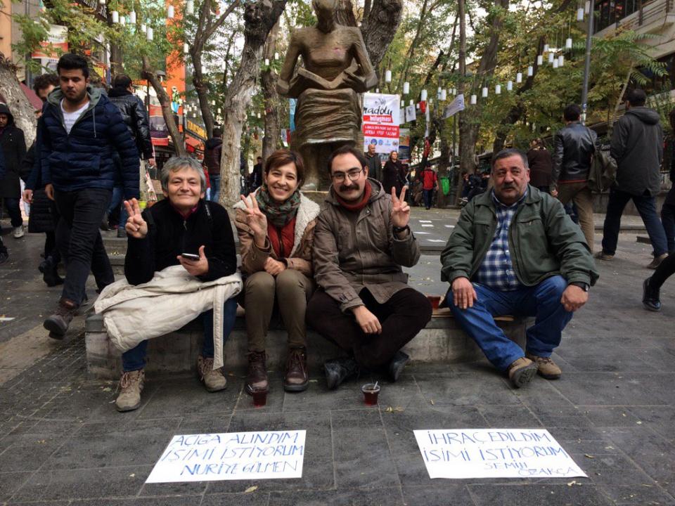 KHK ile ihraç edilmelerinin ardından Ankara Kızılay’da Yüksel Caddesi’nde polisin onlarca kez saldırısına uğrayan Selçuk Üniversitesi Öğretim Görevlisi Nuriye Gülmen Nuriye Gülmen ve öğretmen Semih Özakça, işe iade talepleriyle başlattıkları açlık grevinin 61. günündeler.