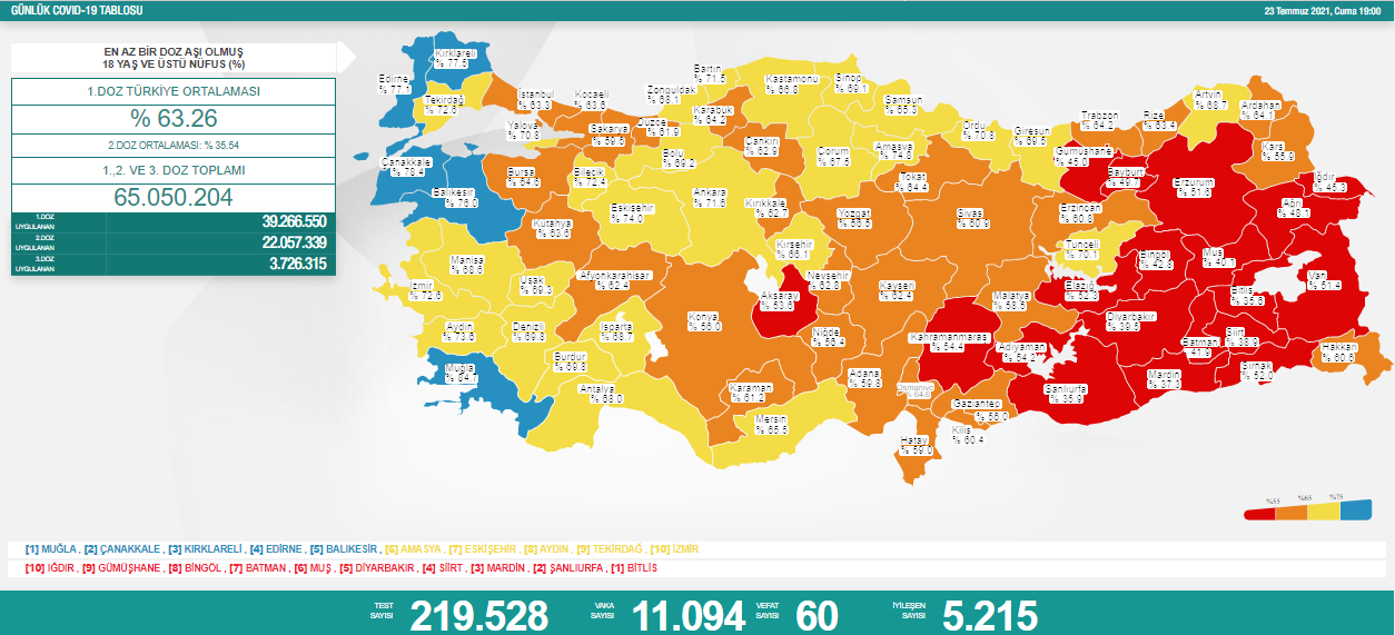 Sağlık Bakanlığı, Türkiye Günlük Koronavirüs Tablosu’nun güncel verilerini paylaştı. 23 Temmuz verilerine göre, 219 bin 528 test yapıldı. Son 24 saatte, 11 bin 94 yeni vaka tespit edilirken 60 kişi hayatını kaybetti. 5 bin 215 kişi ise sağlığına kavuştu.