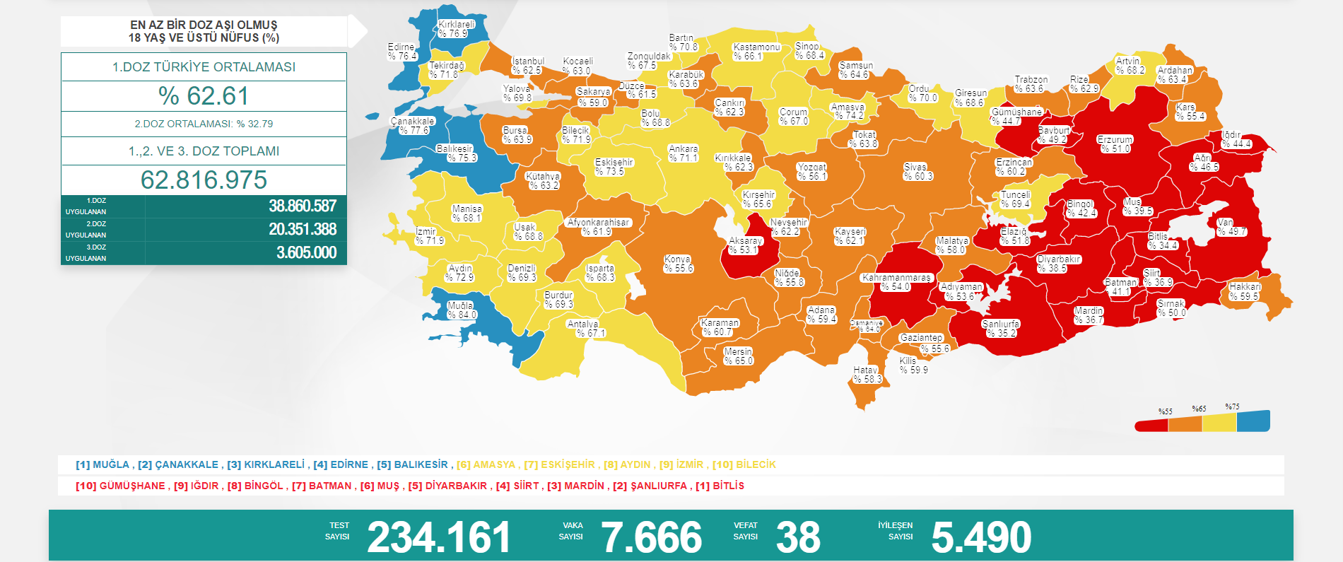 Türkiye Günlük Koronavirüs Tablosu’nun güncel verileri paylaşıldı. Son 24 saatte 234 bin 161 Covid-19 testi yapıldı, 7 bin 666 kişinin testi pozitif çıktı, 38 kişi hayatını kaybetti.