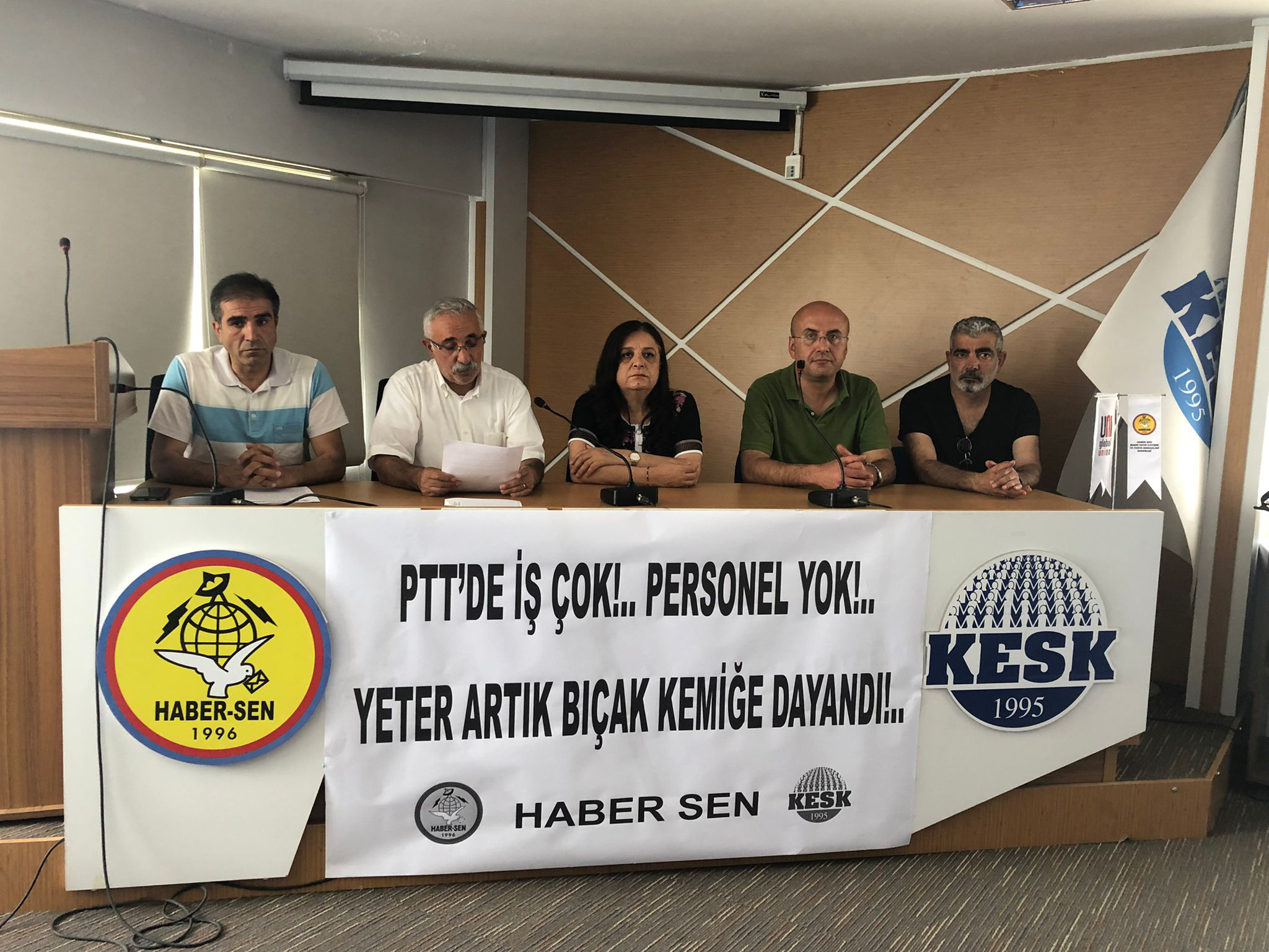 Ankara’da sendika genel merkezinde yapılan açıklamada salona, ‘PTT’de iş çok, personel yok, yeter artık bıçak kemiğe dayandı’ pankartı asıldı.