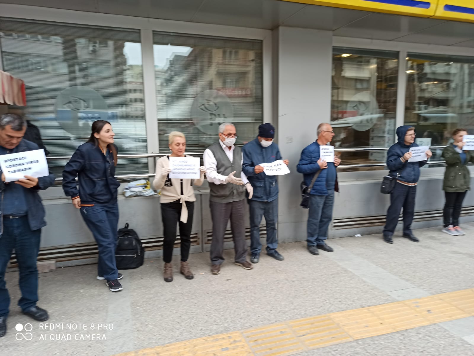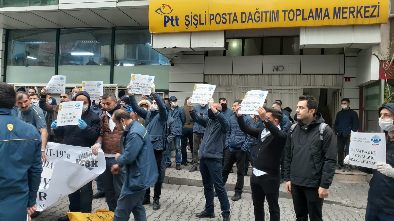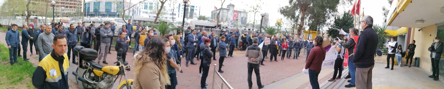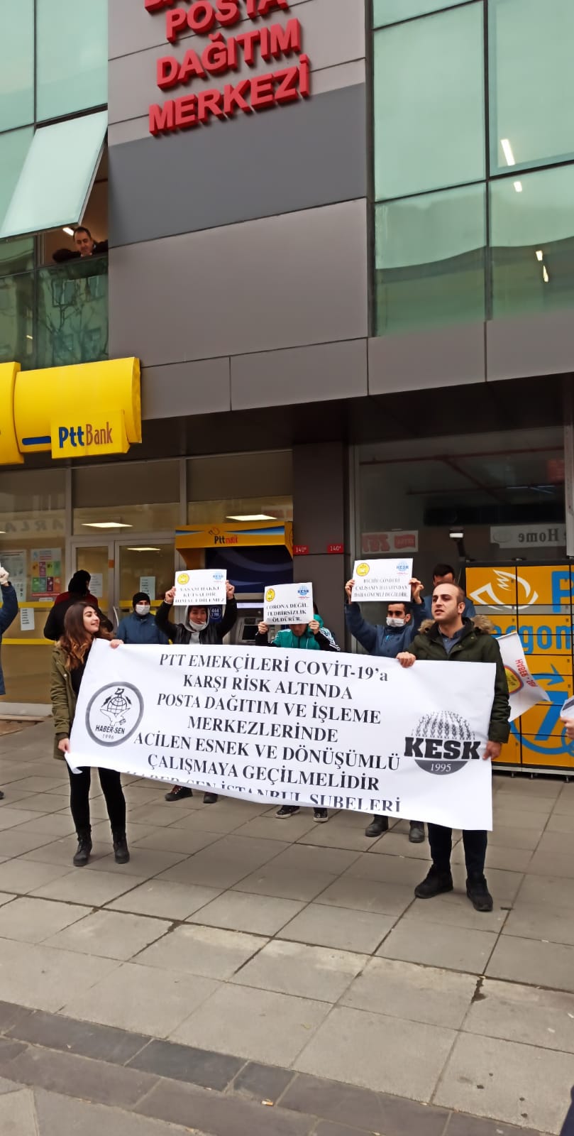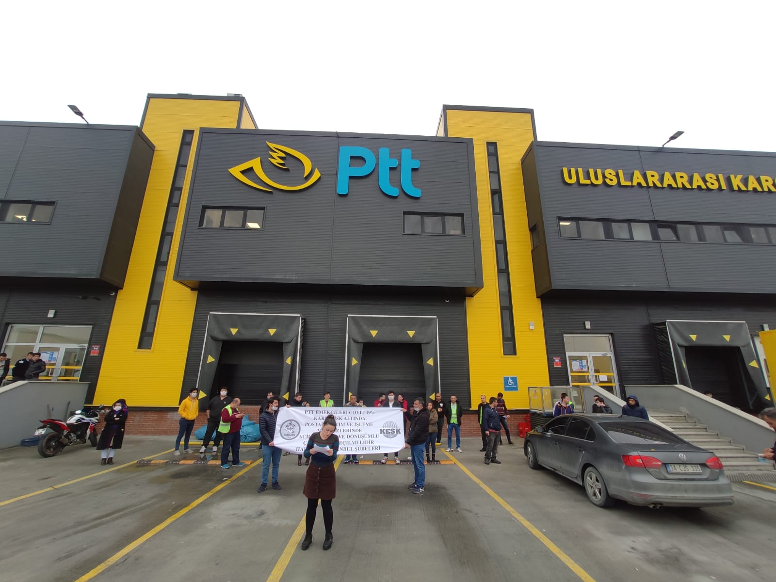 “İş yerlerine dönmeleri istenen emekçiler iş yerlerin döndüklerinde yüzlerce arkadaşıyla birlikte, fiziki çalışma koşullarından kaynaklı sosyal mesafenin oluşamadığı bir ortamda çalışmaya mecbur bırakılmışken virüsün bulaşması problem edilmezken; bizlerin bu sorunlarımızın ve daha fazlasının çözülmesi için basın açıklaması yapmak isterken yasaklarla engellenmesini kınıyor ve doğru bulmuyoruz. Yine çıkarılan 2020/4 sayılı cumhurbaşkanlığı genelgesi ile çalıştırılma biçimine bakılmaksızın, tüm kamu kurum ve kuruluşlarında esnek dönüşümlü ve uzaktan çalıştırılma biçimi getirilmiştir. Ancak PTT dağıtıcıları bu genelgenin dışında tutulmuştur. PTT dağıtıcıları en riskli gruplar arasındayken gerekli tedbirlerin alınmadan çalıştırılmalarına dikkat çekmek ve sorunların çözümünü talep etmek için yapmak istediğimiz açıklamanın yasaklanması kabul edilemezdir.”