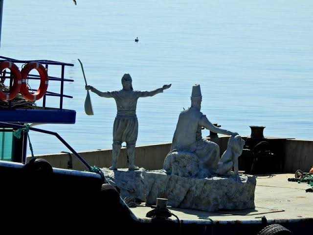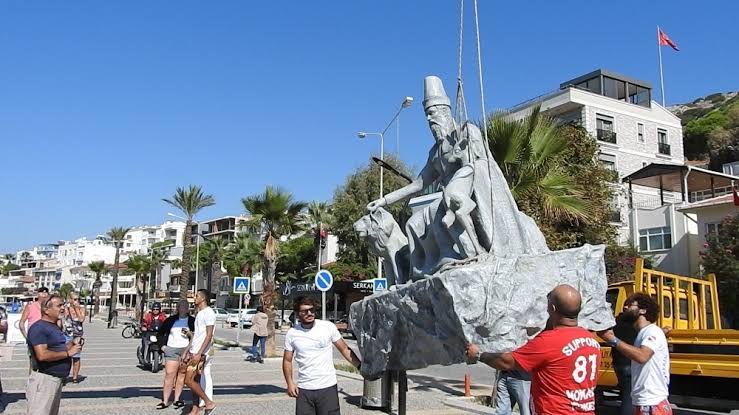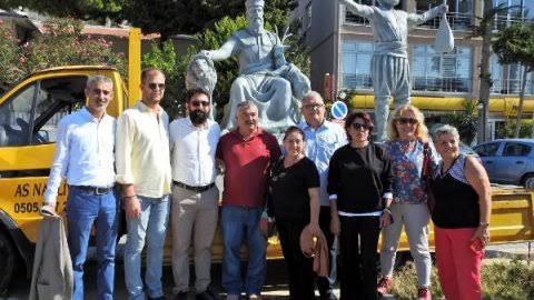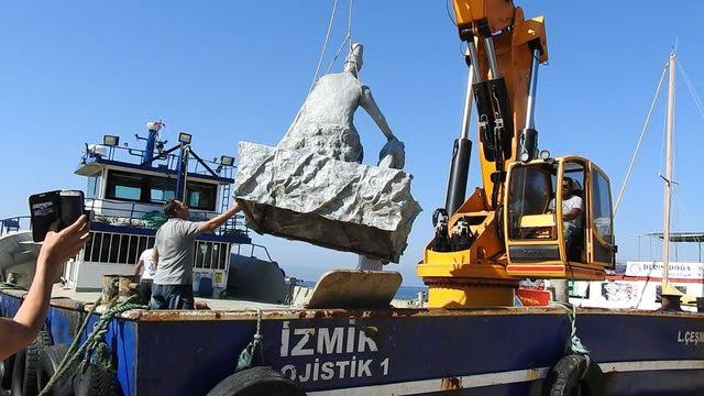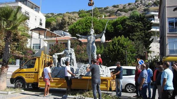 Çeşme sahiline kamyonetle getirilen heykeller, vatandaşların büyük ilgisi ile karşılaşırken, çok sayıda vatandaş hatıra fotoğrafı çektirdi. Heykeller, sahildeki tekneye vinçle taşındı.