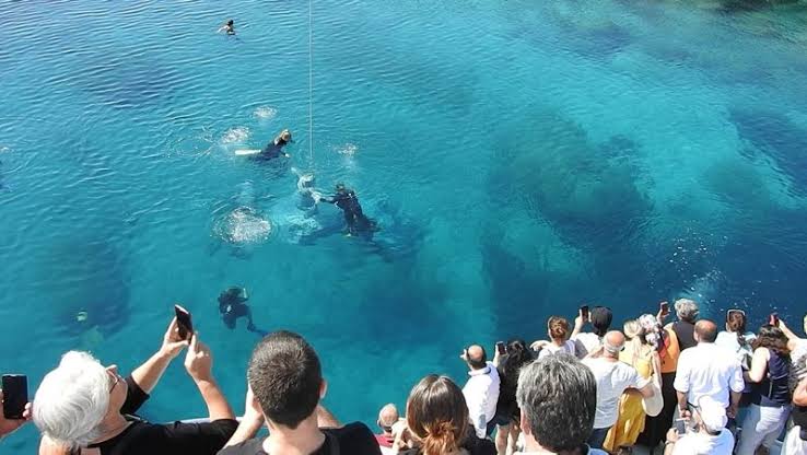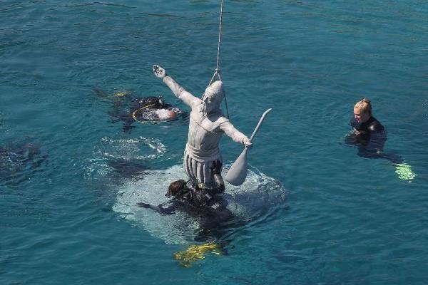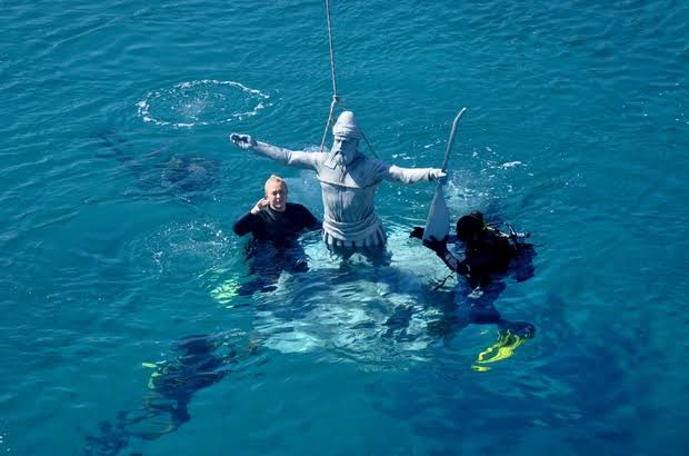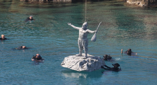 Eşek Adası’nın yanında bulunan Makri Adası’na kadar tekneyle getirilen iki heykel, vinçle ve dalgıçların yardımıyla suya batırılırken, Grand Star gezi teknesinde bulunan STK temsilcileri ve vatandaşlar da heykellerin batırılışını cep telefonları ile görüntülediler.