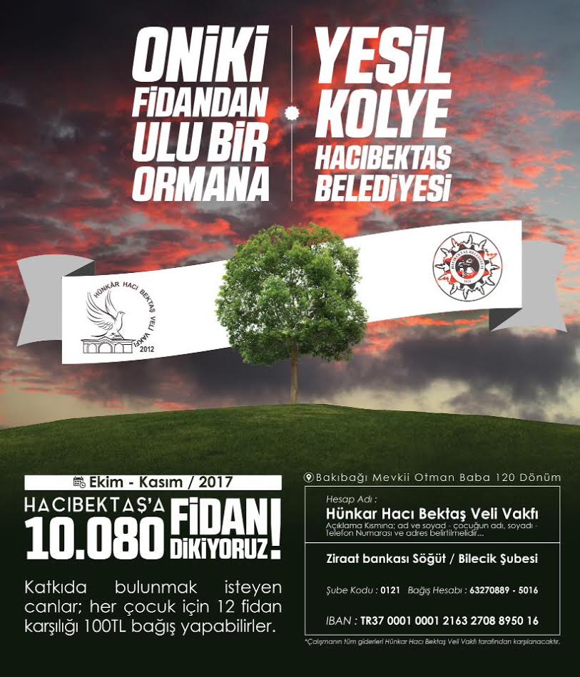 Hünkar Hacı Bektaş Veli Vakfı projesi “On iki fidandan ulu bir ormana” ve Hacıbektaş Belediyesi projesi “Yeşil Kolye” kapsamında Hacıbektaş İlçesi, Bakıbağı Mevkii Otman Baba adlı yere Ekim-Kasım 2017 tarihlerinde (120 dönüm) 10.080 fidan dikimi gerçekleştirilecektir. (HABER MERKEZİ)