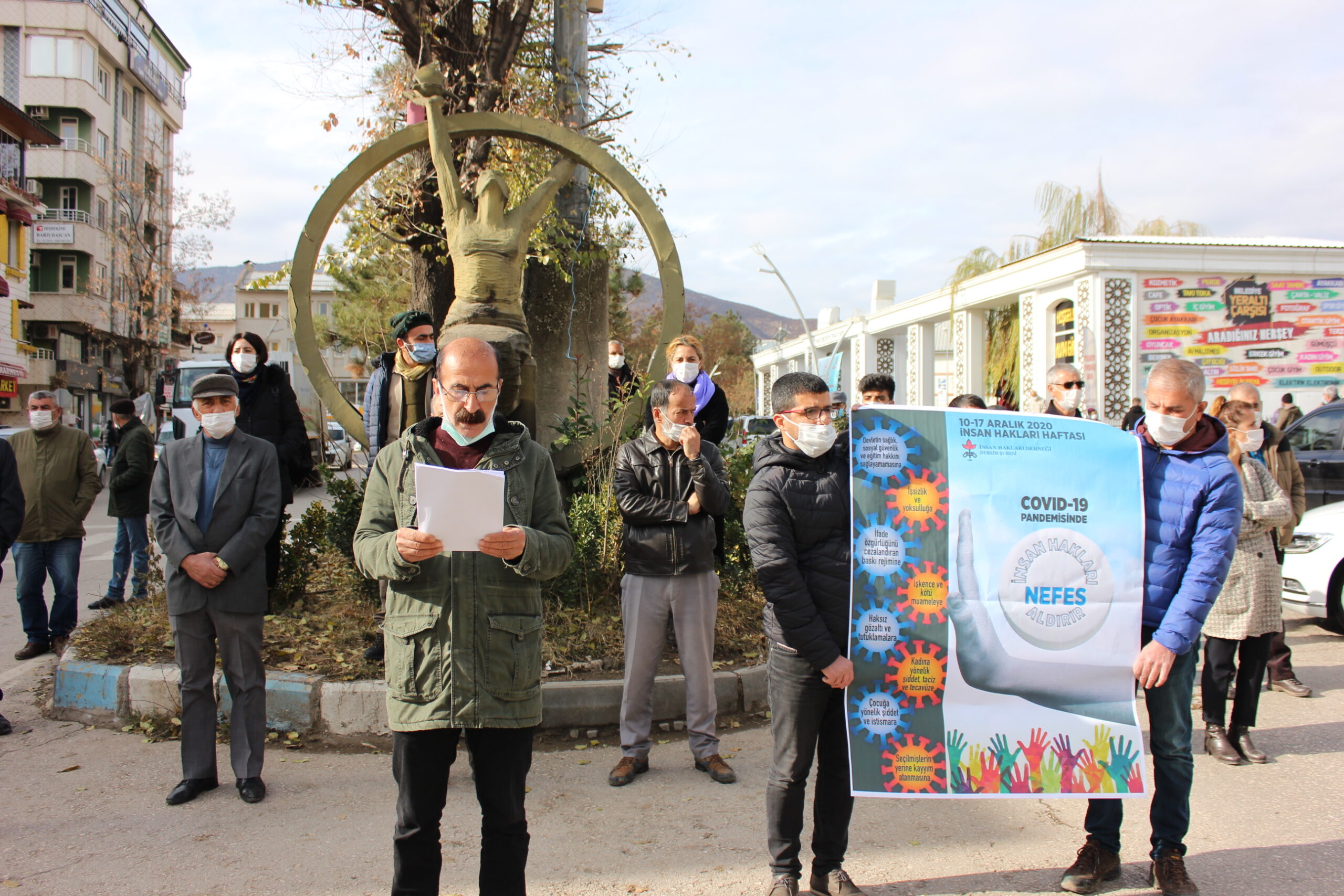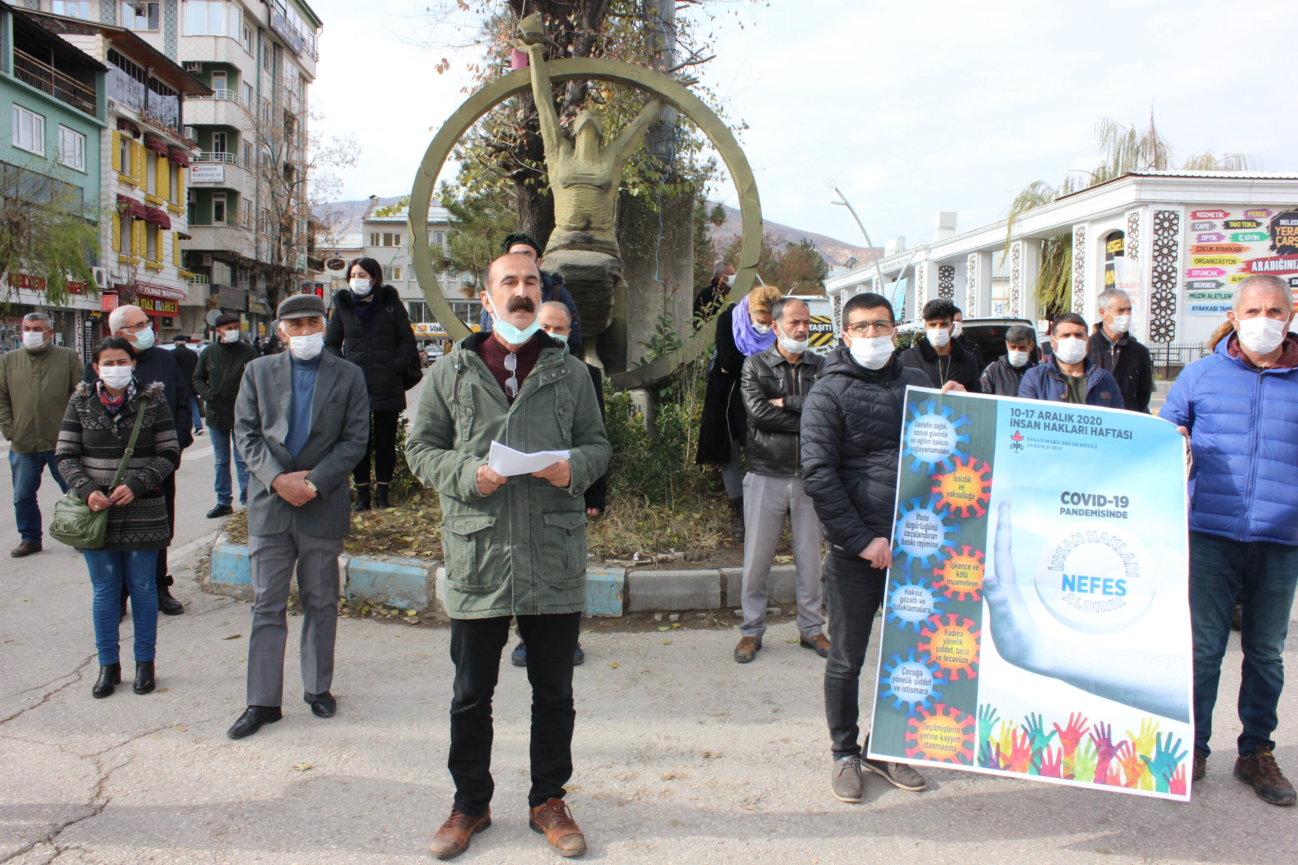 Hak savunucuları, 10-17 Aralık İnsan Hakları haftası sebebiyle Dersim’de özgürlük anıtında basın açıklaması yaptı. “İnsan hakları nefes aldırır” sloganının atıldığı eylemde konuşan İHD Dersim Şube Başkanı Gürbüz Solmaz, 10 Aralık İnsan Hakları Evrensel Beyannamesi’nin kabul ve ilanının 72. Yıldönümü olduğunu hatırlattı.