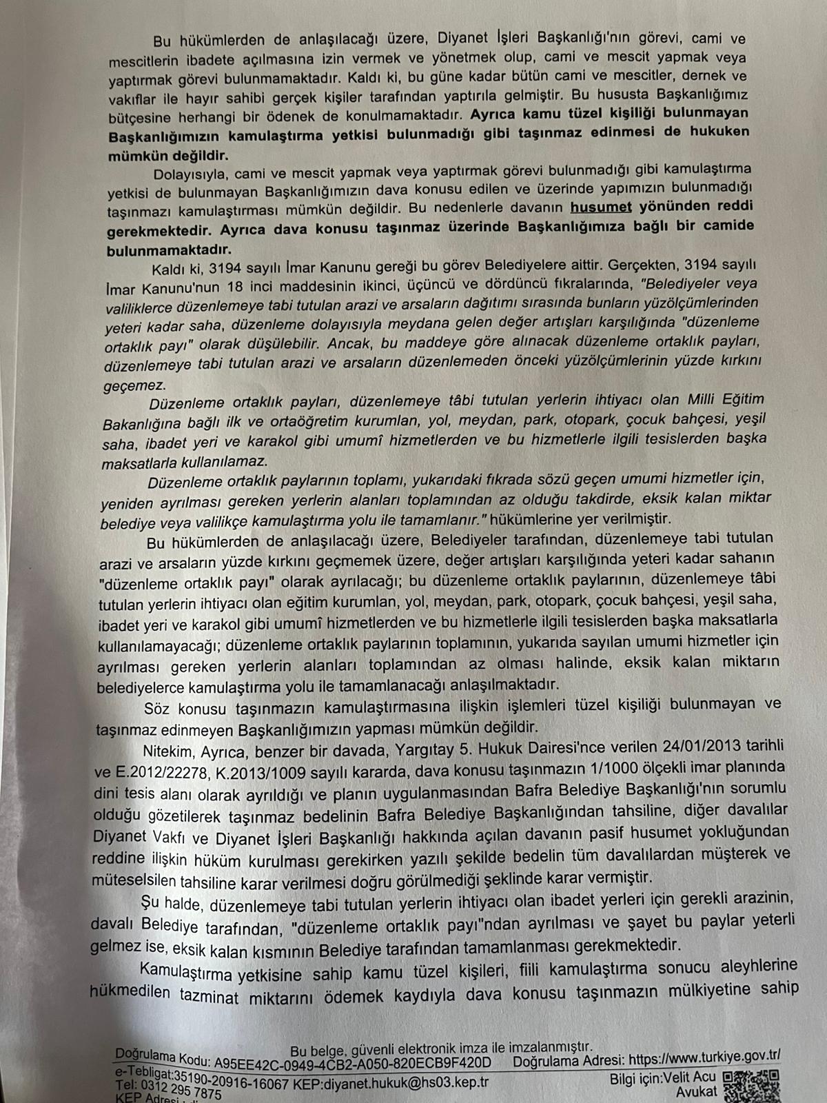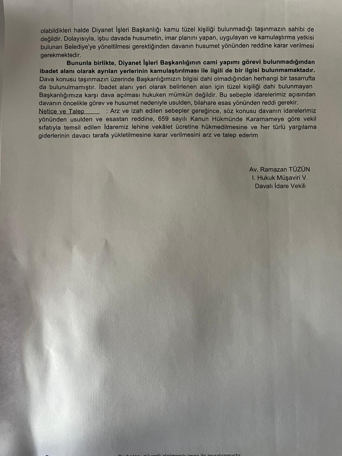 Diyanet İşleri Başkanlığı tarafından, mahkeme heyetine sunulan 3 Ocak 2024 tarihli dilekçesinde dava konusu olan yer ile ilgili envanterlerinde de böyle bir cami bulunmadığını belirtilmiş.