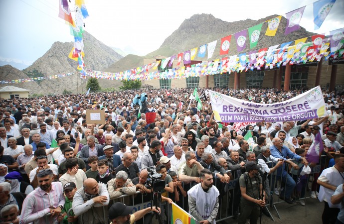 DEM Parti Eş Genel Başkanı Tuncer Bakırhan da konuşmasında iktidara tepki göstererek, “Neymiş belediye eş başkanımızın soruşturması varmış. Allah sizin belasını versin. Soruşturması olmayan Kürt mü var? 7 yaşından 80 yaşına kadar fişlemediğiniz soruşturma açmadığınız dava açmadığınız tek bir Kürt muhalif bu ülkede bıraktınız mı? Hayır! takiye yapıyorlar. Geçen dönemki Hakkari Belediye eş başkanımızın hiçbir soruşturması yoktu. Oğlunun cenazesine katıldığı için kayyım atadılar. Bir başka belediye eş başkanımızın davası yok aday tanıtım toplantısına katıldığı için görevinden alındı. Bir insan partisi tarafından aday gösterilince aday tanıtımı yapmaz mı? Bunu AKP yapıyor, CHP, MHP yapıyor ama Kürt kendi aday tanıtım toplantısına katılınca bu suç oluyor. Soruşturma oluyor ve yerine kayyım atanma gerekçesi yapılıyor. Bakın bir başka belediye eş başkanımız hiçbir soruşturması yoktu geçen dönem niye kayyım atadılar? Diyor ki 8 Mart etkinliğine katıldı. Değerli arkadaşlar bu yalancılar, başları secdede elleri semada ama akılları Kürt düşmanlığında olan bu yalancılar sizi kandırmaya çalışıyorlar. Ama onurlu Kürt halkı, kimin yalan söylediğini biliyor” dedi.