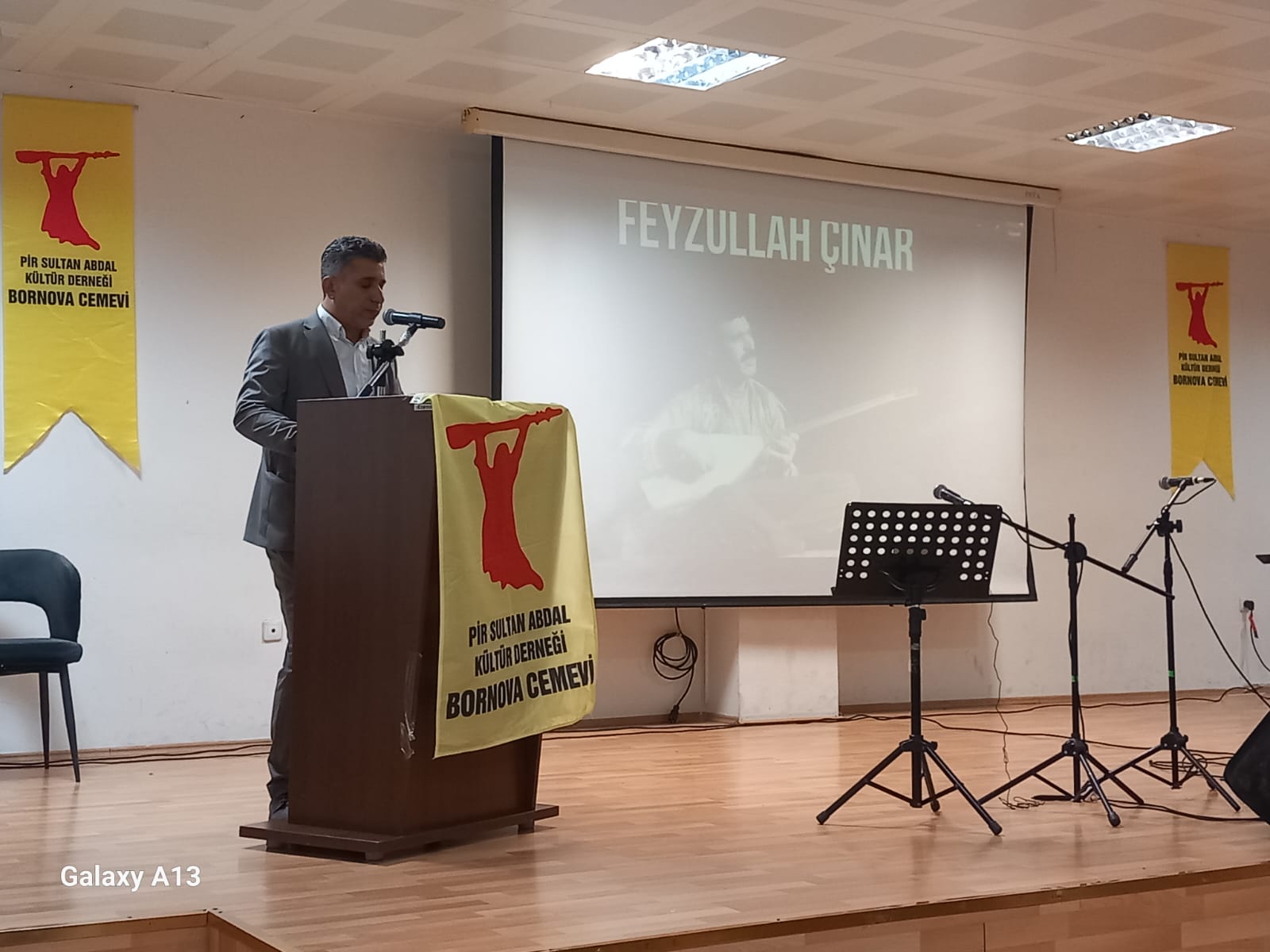 Çelik, devamında ise, “Onun türküleri, sadece birer melodi değil; birer direniş çağrısı, birer insanlık dersi, birer barış duasıdır. Feyzullah Çınar’ın mirası bize bir yol bırakmıştır. O yol, Pir Sultan’ın yoludur; O yol, hakikatin, adaletin, kardeşliğin yoludur. Bizler Bornova Cemevi olarak, bu yolun bugünkü yürüyenleriyiz. Alevi kültürünü, ozan geleneğini, insanı merkeze alan bu inancı yaşatmak, Feyzullah Çınar’a, Pir Sultan’a, bütün hakikat erenlerine olan borcumuzdur” ifadelerini kullandı.