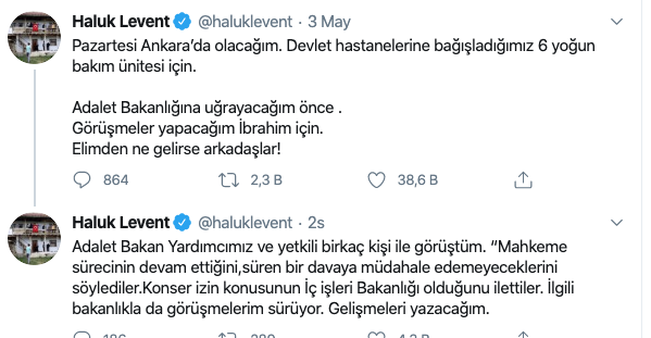 Levent, yaptığı görüşme ile ilgili sosyal medya hesabından yaptığı açıklamada “Adalet Bakan Yardımcımız ve yetkili birkaç kişi ile görüştüm. “Mahkeme sürecinin devam ettiğini, süren bir davaya müdahale edemeyeceklerini söylediler. Konser izin konusunun İçişleri Bakanlığı olduğunu ilettiler. İlgili bakanlıkla da görüşmelerim sürüyor. Gelişmeleri yazacağım” ifadelerini kullandı.
