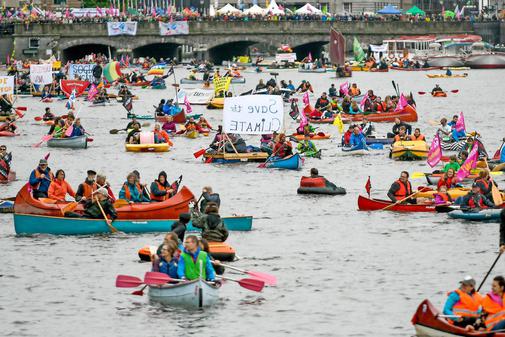 Sadece Hamburg sokakları değil, Alster Nehri de gösteriye sahne oldu. Kanolara binen göstericiler, nehir üzerinde eylem yaptı. Çevre örgütü Greenpeace de kömür yüklü bir gemiye Merkel’in afişini astığı bir eylem gerçekleştirdi.