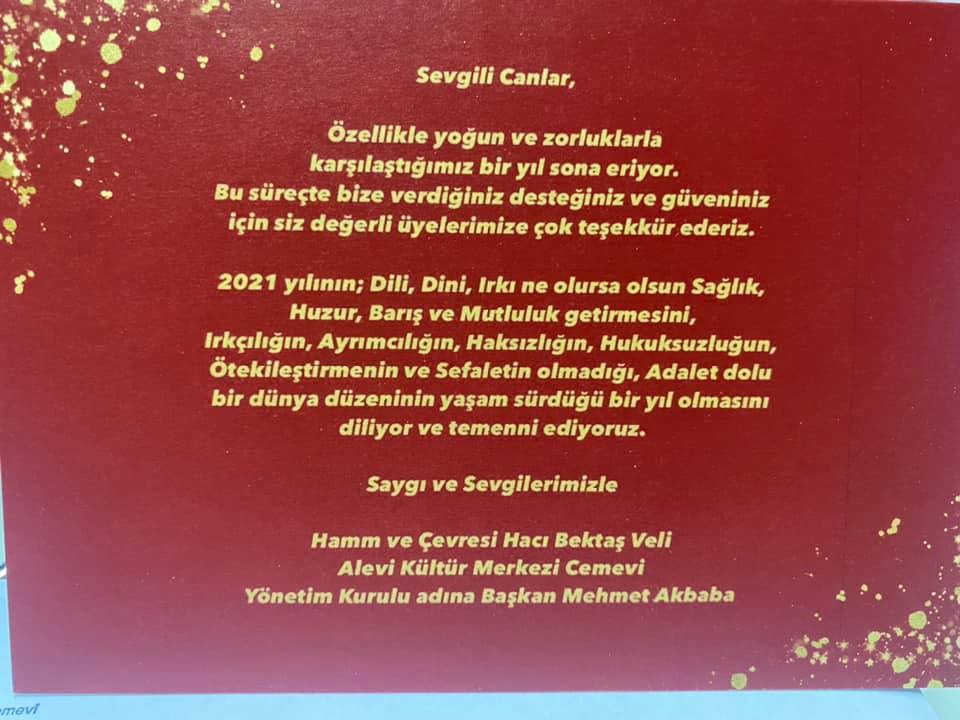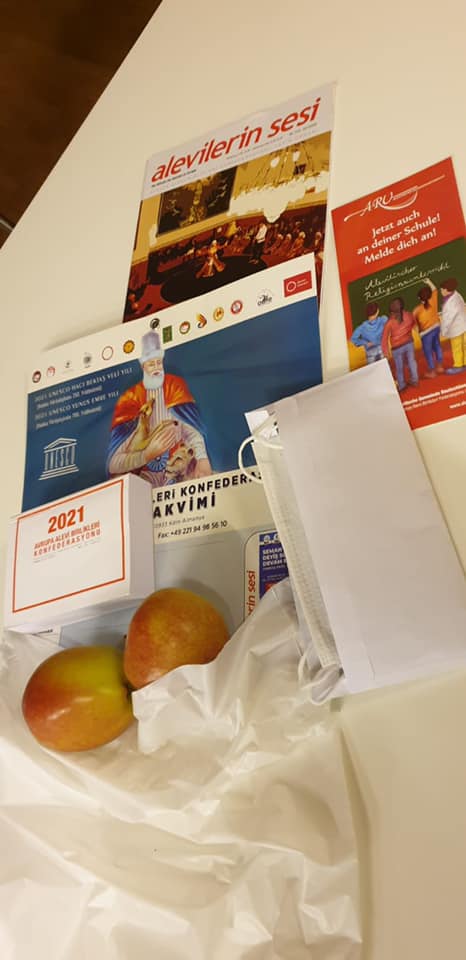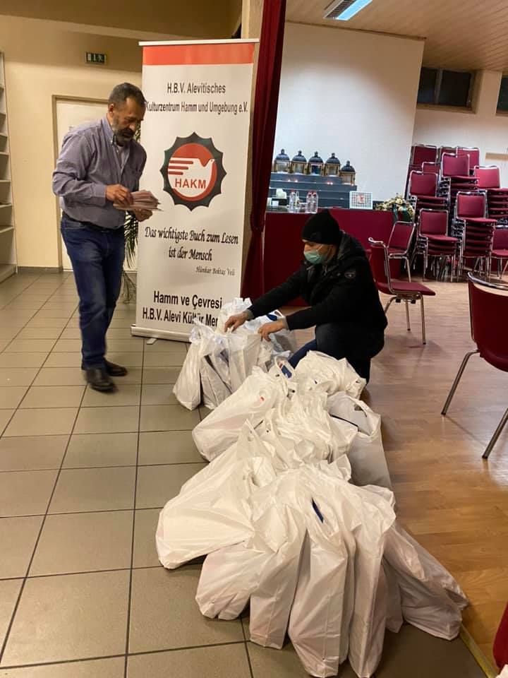 Hamm Hacı Bektaşi Veli Alevi Kültür Merkezi/Cemevi Başkanı Mehmet Akbaba, “Hamm Cemevi yönetimi olarak tüm insanlık için zor geçen bu zamanlarda üyelerimizi unutmadığımızı göstermek için yönetim kurulumuzun birlikte hazırladığı hediyeli torbalarla belirli yaş gurubuna yönelik olarak bu aksiyonu gerçekleştirdik. Bu hizmetle federasyonumuzun 2021 yapraklı duvar takvimi, yayın organımız Alevilerin Sesi Dergisi, Maske ve Yılbaşı kartıyla birlikte kapılarına kadar giderek ayaküstü de olsa onlara hal hatır sorup lokmalarını ulaştırdık‘’ dedi.