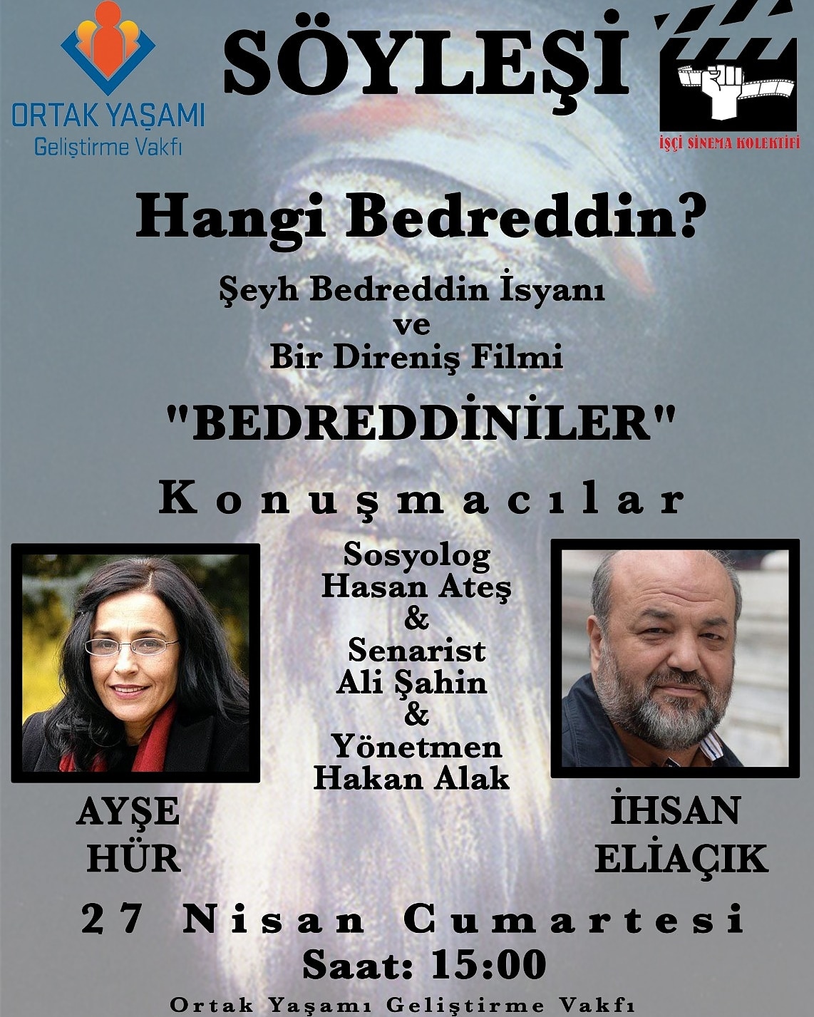 Ortak Yaşamı Geliştirme Vakfı ve İşçi Sinema Kolektifi’nin ortak düzenlediği ‘Hangi Bedreddin’ Şeyh Bedreddin İsyanı ve Bir Direniş Filmi “Bedreddiniler” söyleşisi 27 Nisan’da gerçekleşecek. Ortak Yaşamı Geliştirme Vakfı’nda yapılacak söyleşiye Sosyolog Hasan Ateş, Senarist Ali Şahin, Yönetmen Hakan Alak ve İhsan Eliaçık, Ayşe Hür katılacak. Söyleyiş 27 Nisan Cumartesi günü  saat 15.00’da başlayacak. (HABER MERKEZİ)