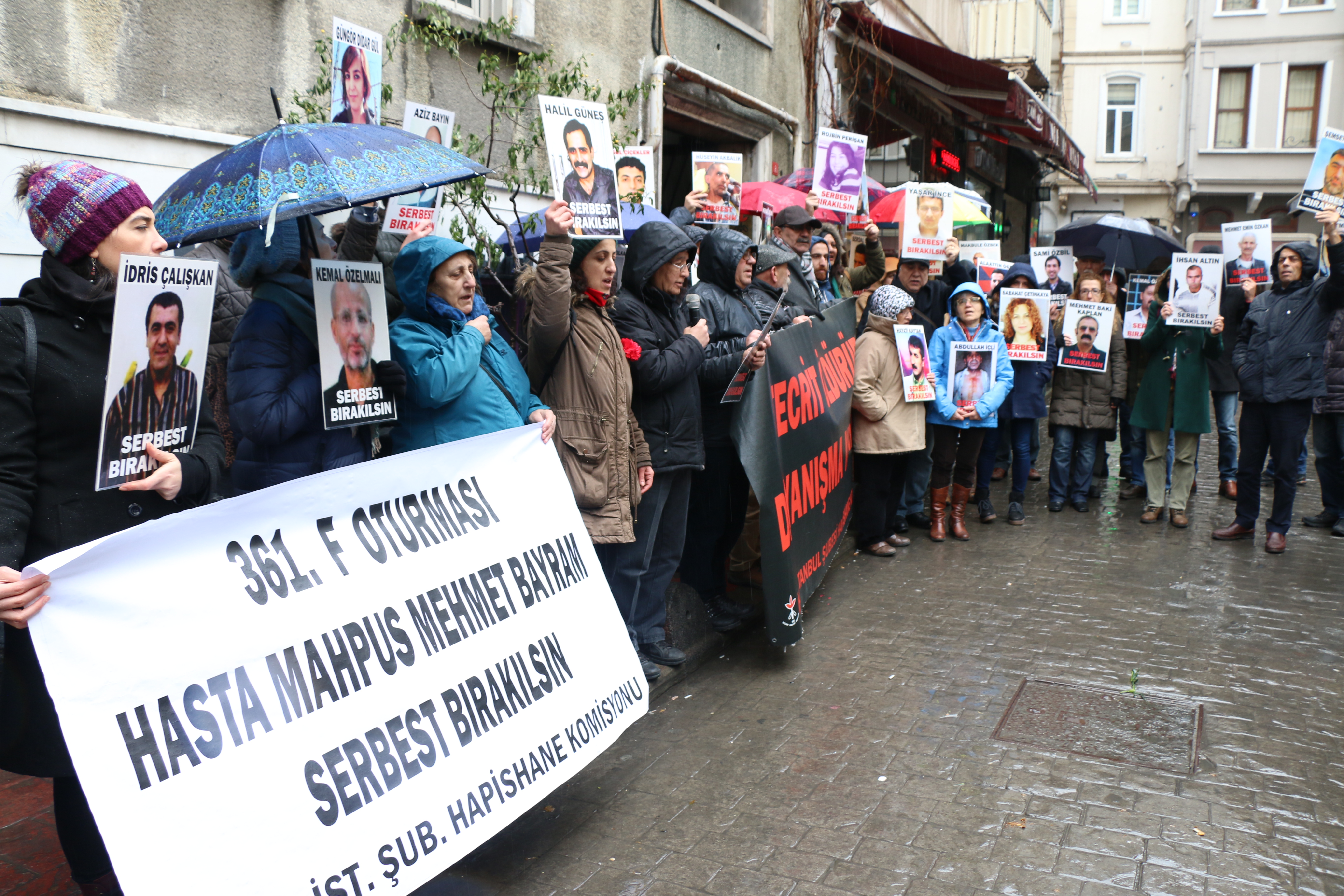 Hapishanelerde yaşanan hak ihlallerine ve hasta mahpusların durumlarına dikkat çekilmek amacıyla düzenlenen F Oturması eyleminin bugün 361’inci haftası. 27 haftadır İnsan Hakları Derneği İstanbul Şubesi’nin bulunduğu Beyoğlu Çukurlu Çeşme Sokak’ta abluka altında gerçekleşen F Oturması, bu hafta da abluka altında yapıldı.