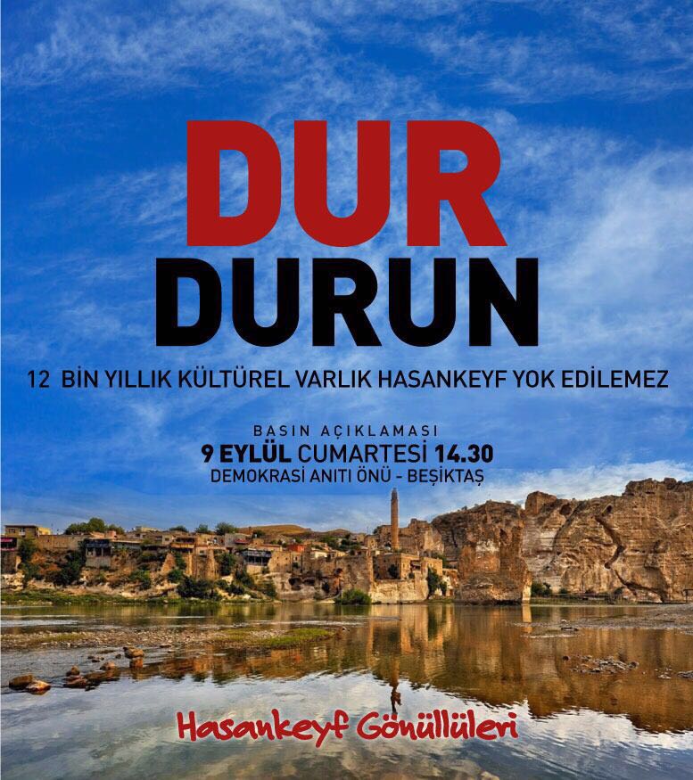 Bu yüzden biz Hasankeyf Gönüllüleri olarak biraraya gelen (Adıyaman Dernekleri,Ağrı Dernekleri ,Amed Dernekleri,Arkeologlar Derneği İstanbul Şubesi,Artvin Çevre Platformu,Barış Bloku,Başka Bir Atölye (B1A),Batman Dernekleri Federasyonu (Elih-BADEF) , Bingöl Dernekleri, Bitlis Dernekleri Federasyonu, Çağdaş Erzurum Dernekleri Federasyonu (ÇEDF), Demokratik Alevi Dernekleri, Dersim Dernekleri Federasyonu (DEDEF), Divriği Kültür Derneği, Doğu-Güneydoğu Dernekleri (DGD) Platformu, Erzurum Dernekleri, Haliç Dayanışması, Halkların Demokratik Kongresi İstanbul Ekoloji Meclisi, Halkların Demokratik Kongresi Antalya Ekoloji Meclisi, Halkların Demokratik Kongresi, Mimarlar ve Şehir Planlamacıları Meclisi, Karadeniz İsyandadır Platformu, Karakoçan Dernekleri Federasyonu, Kars Dernekleri, KAYYDER, Iğdır Derneği, İstanbul Hakkari Der , Mardin Dernekleri Federasyonu, Muş Dernekleri, Peri Vadisi Koruma Platformu, Senoz Vadisi Koruma Platformu, Siirt Dernekleri, Şanlı Urfa Dernekleri , Şırnak Dernekleri , Tüm Tokatlılar Derneği (TÜM TOK), Van Dernekleri, Yaşam ve Dayanışma Yolcuları, Yeşil Direniş Ekoloji ve Yaşam Gazetesi, Yeşil Öfke Ekoloji Kolektifi), başlangıç adımı olarak, 9 Eylül Cumartesi günü, saat 14.30’da, Beşiktaş Demokrasi Anıtı, arkeolojik kazı alanı önünde biraraya geleceğiz, sizlerle çoğalacağız. Hepinizi Hasankeyf’i yaşatma çabamıza; basın açıklamasına bekliyoruz.”
