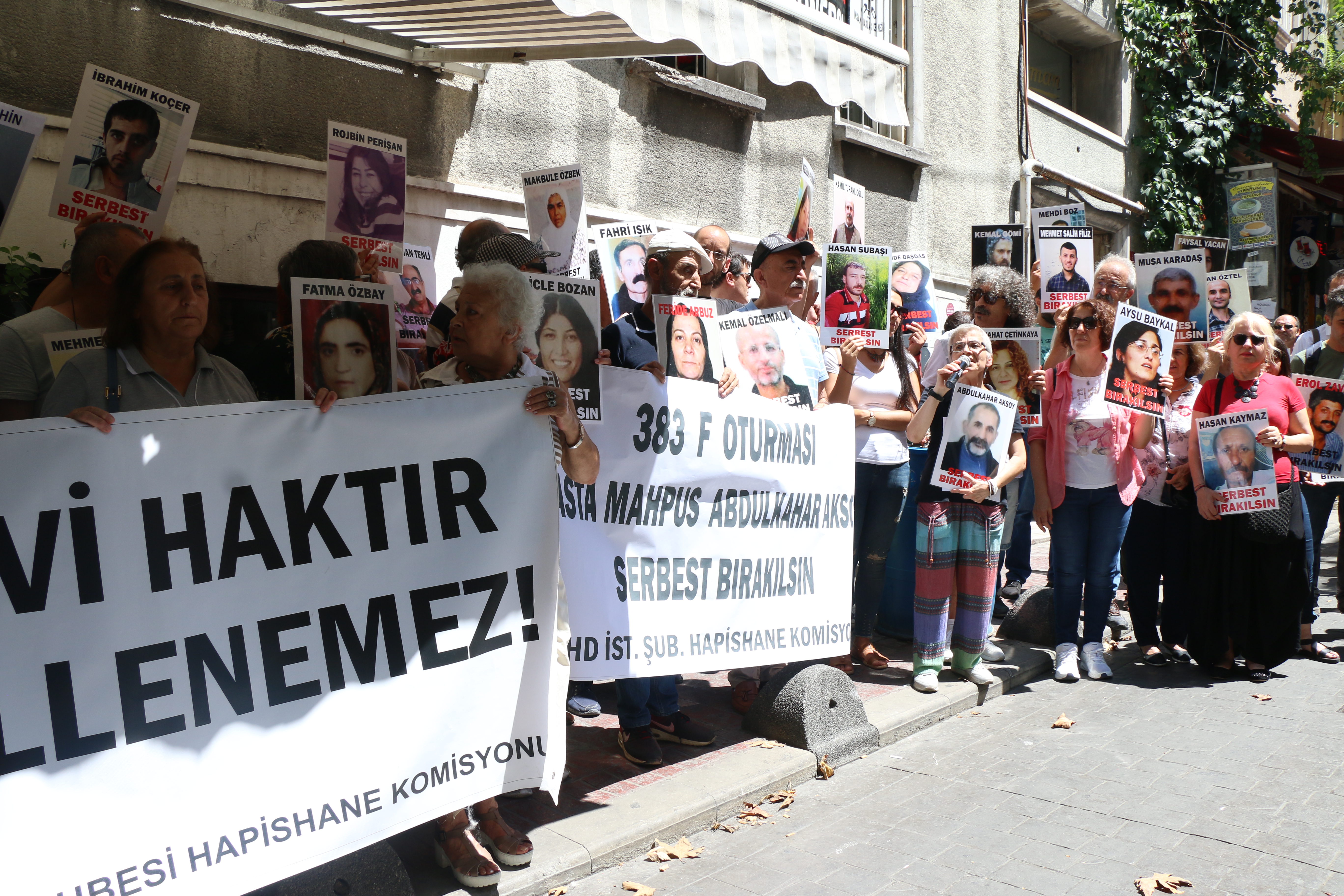İnsan Hakları Derneği (İHD) İstanbul Şubesi Hapishane Komisyonu’nun hasta tutukluların durumuna ve cezaevi koşullarının durumuna dikkat çekmek amacıyla düzenlediği F Oturması eyleminin 383. haftası gerçekleştirildi. Galatasaray Meydanı’ndaki eylem yasakları nedeniyle eylem İHD’nin Taksim’de bulunan binası önünde yapıldı.