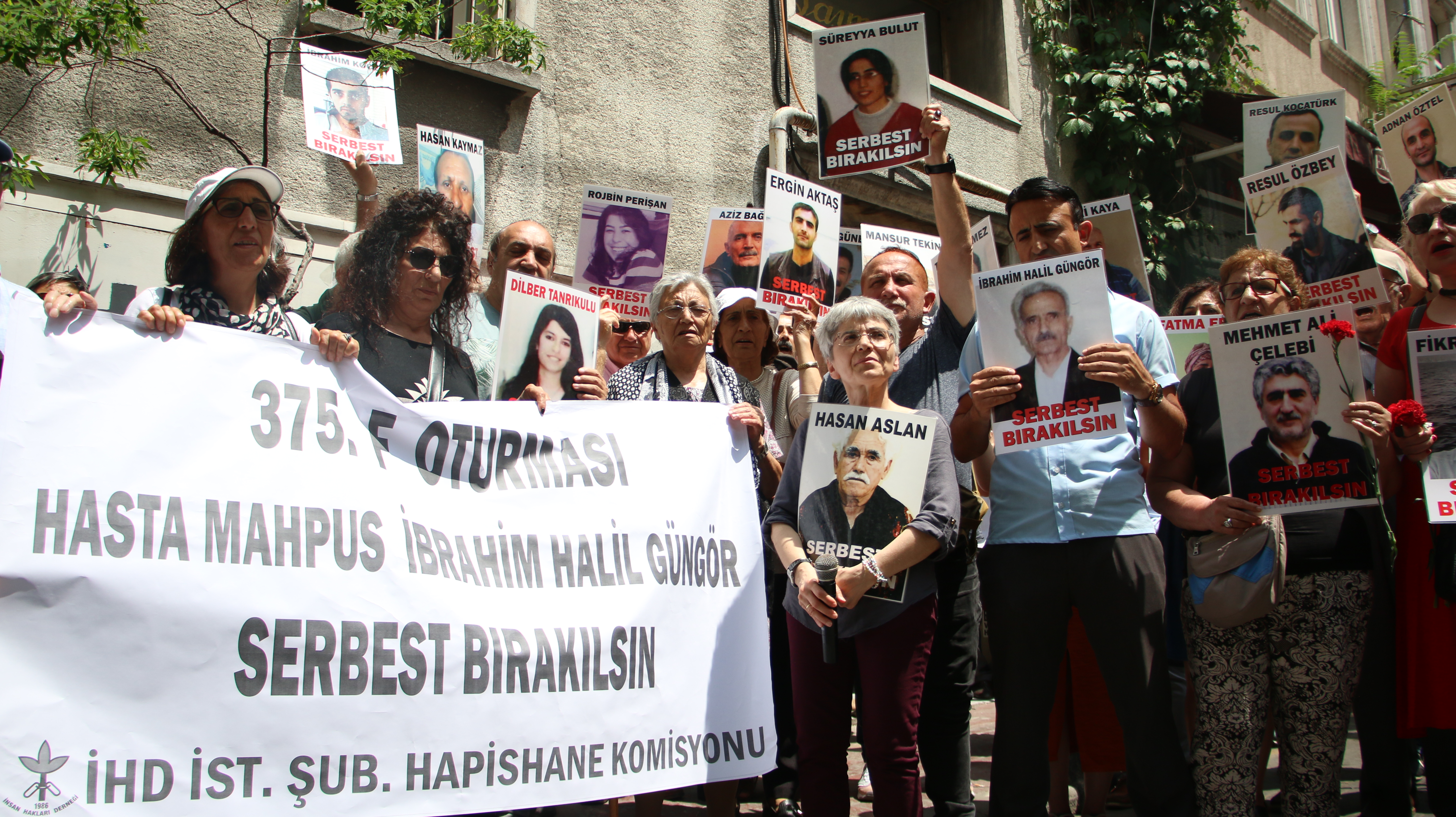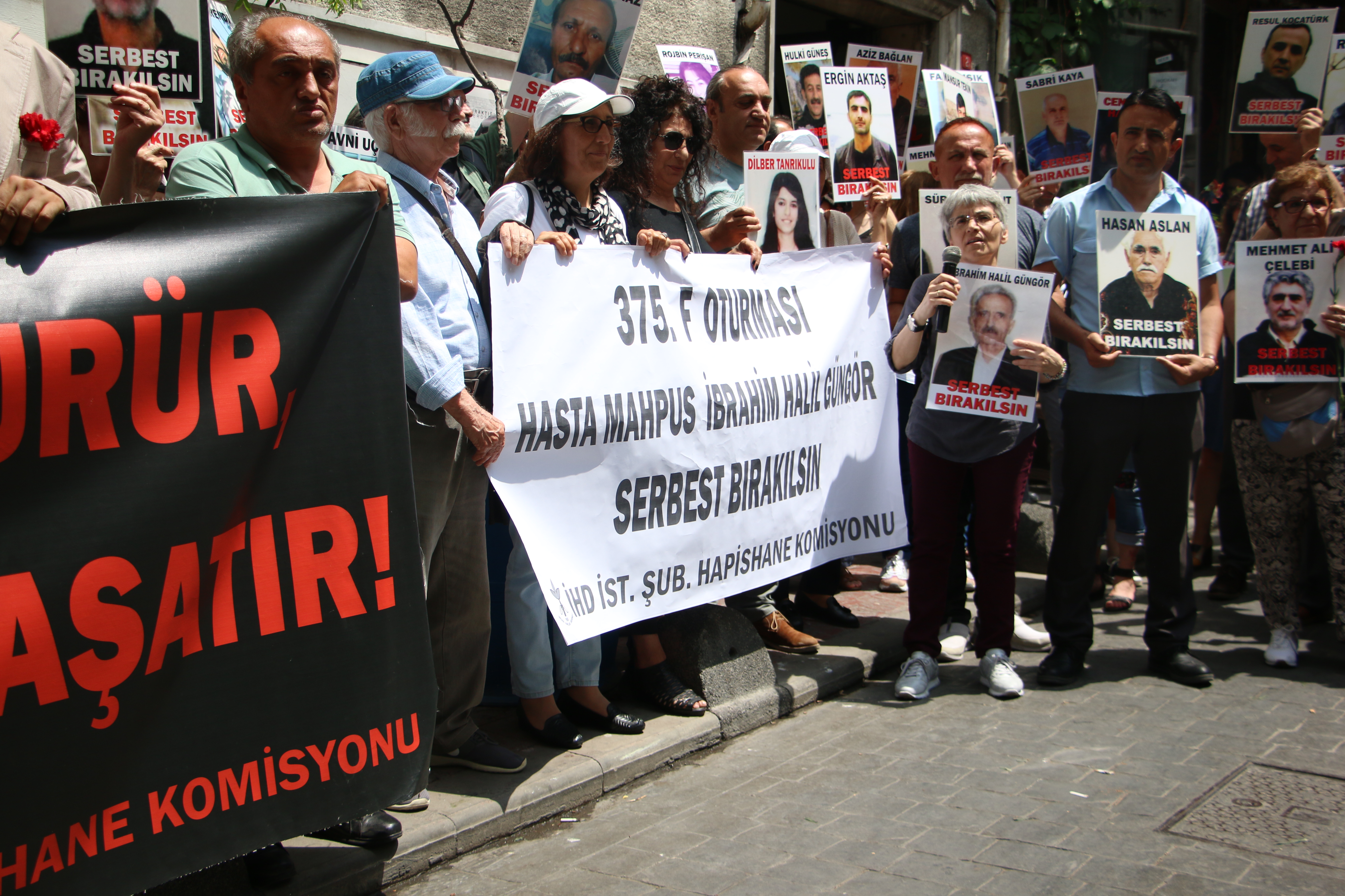 İnsan Hakları Derneği (İHD) İstanbul Şubesi Hapishane Komisyonu’nun hasta tutukluların serbest bırakılması talebiyle Galatasaray Meydanı’nda yapmak istediği “F Oturması”nın 375’inci haftası da polis tarafından engellendi. Bunun üzerine açıklama İHD’nin Taksim’de bulunan binası önünde yapıldı. Hasta tutukluların fotoğraflarının taşındığı açıklamada, “Hasta mahpuslar serbest bırakılsın” ve “Tecrit öldürür dayanışma yaşatır” pankartları açıldı. Bu hafta hasta tutuklu olan ve hastaneye sevki yapılmayan yüzde 78 engelli İbrahim Halil Güngör’ün (74) durumuna dikkat çekildi.