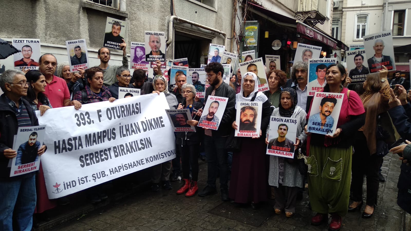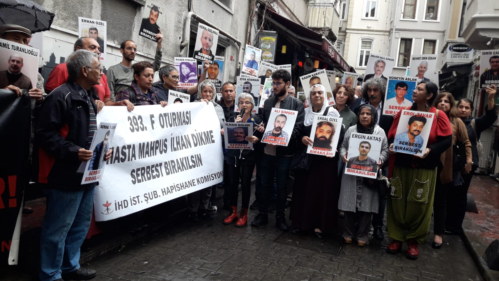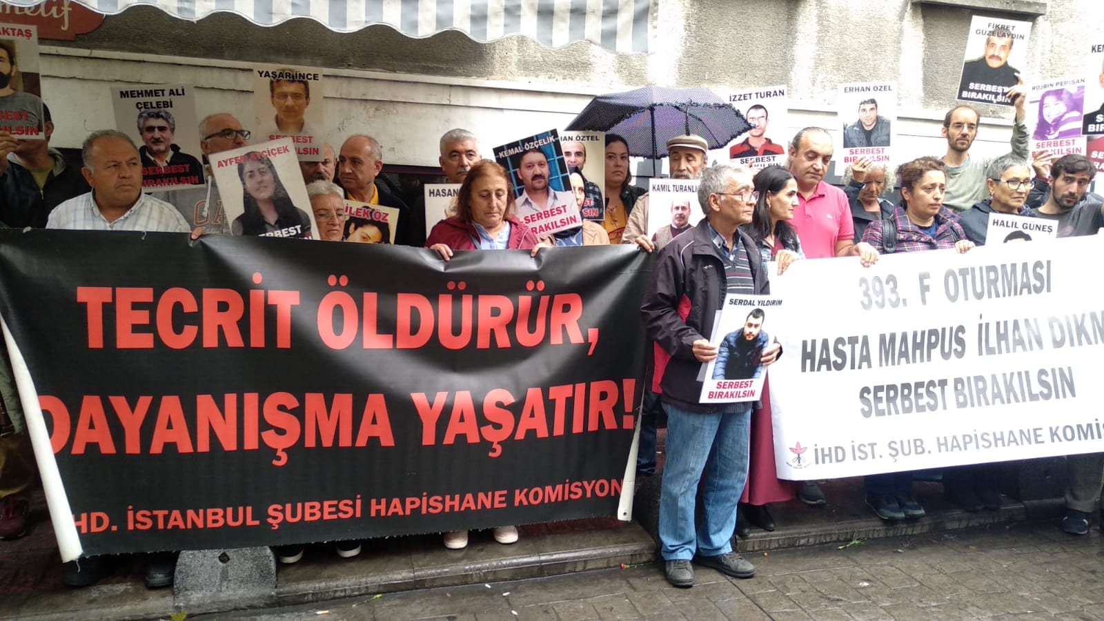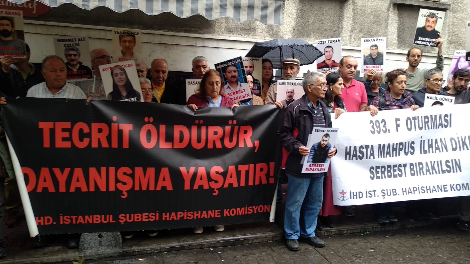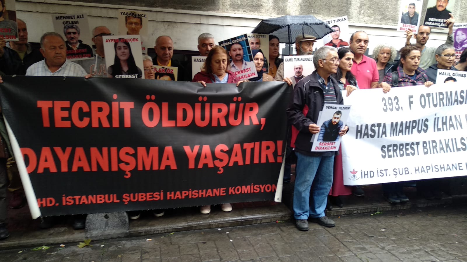 İnsan Hakları Derneği (İHD) İstanbul Şubesi Hapishane Komisyonu’nun hasta tutukluların serbest bırakılması talebiyle Galatasaray Meydanı’nda yapmak istediği ‘F Oturması’nun 393’üncü haftası da polis tarafından engellendi. Bunun üzerine açıklama İHD’nin Taksim’de bulunan binası önünde yapıldı. Hasta tutukluların fotoğraflarının taşındığı açıklamada, “Tecrit öldürür, dayanışma yaşatır!” ve “Hasta Mahpus İlhan Dikme serbest bırakılsın” pankartları açıldı.