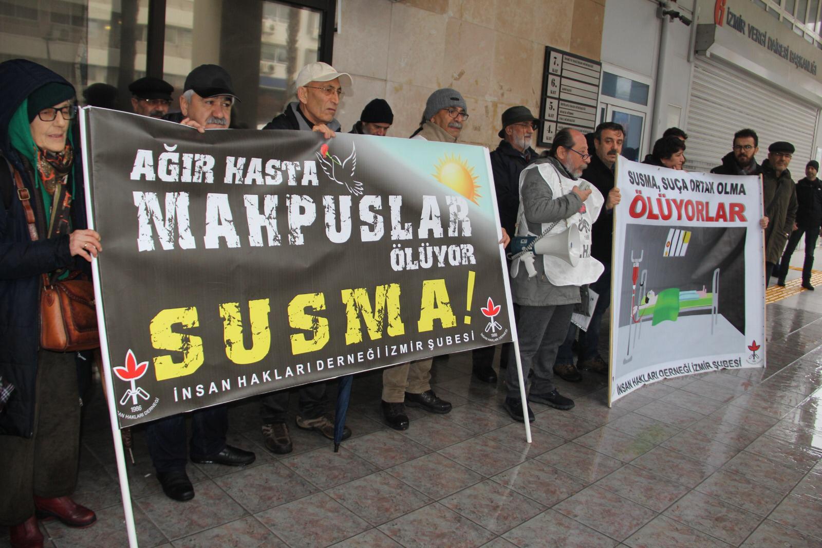 İnsan Hakları Derneği (İHD) İzmir Şubesi, bu hafta 12 yılıdır Aliağa Şakran 4 No’lu T Tipi Cezaevi’nde bulunan hasta tutuklu Gıyaseddin Sevmiş’in durumuna ve cezaevinde yaşanan baskılara ilişkin gönderdiği mektup okundu. Konak ilçesinde bulunan Başbakanlık binası önünde yapılan açıklamada “Ağır hasta mahpuslar ölüyor, susma”, “Susma, suça ortak olma, ölüyorlar” pankartları açılırken mektubu İHD yöneticisi Ahmet Çiçek okudu.
