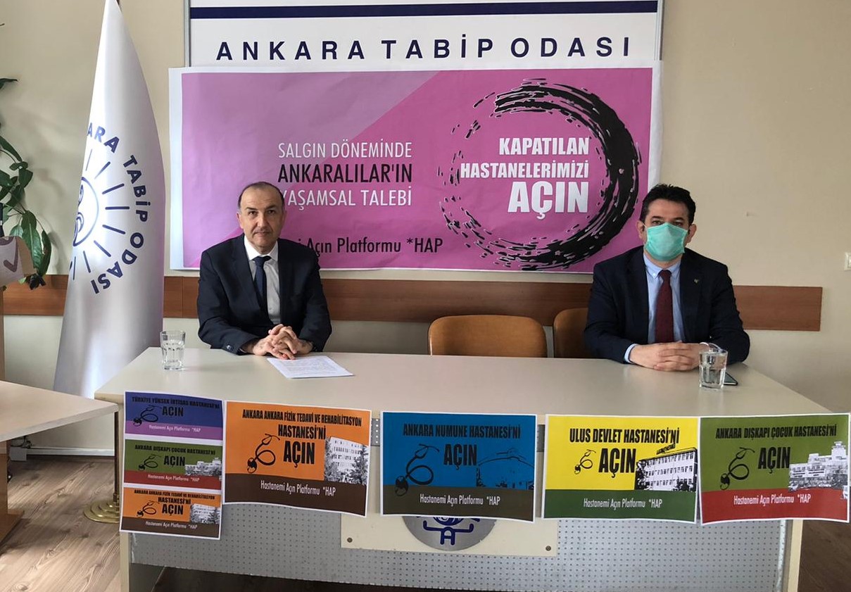 Hastanemi Açın Platformu ile birlikte gerçekleştirilen açıklamada, Ankara’da kapatılan hastanelerin Sağlık Bakanlığı tarafından gerekçesiz ve ihtiyacın olmasına rağmen kapatıldığı, bugün Ankara’nın sağlık konusunda yetersiz kalmasının nedeninin de bu olduğu belirtildi. Dr. Beyazıt İlhan, “6 hastanesi kapatılan Ankara salgına hazırlıksız yakalandı” dedi.