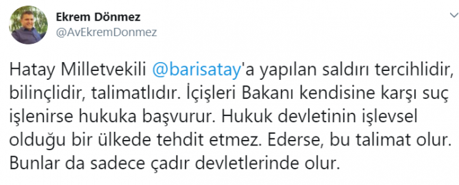 “Hatay Milletvekili Barış Atay’a yapılan saldırı tercihlidir, bilinçlidir, talimatlıdır. İçişleri Bakanı kendisine karşı suç işlenirse hukuka başvurur. Hukuk devletinin işlevsel olduğu bir ülkede tehdit etmez. Ederse, bu talimat olur. Bunlar da sadece çadır devletlerinde olur.”