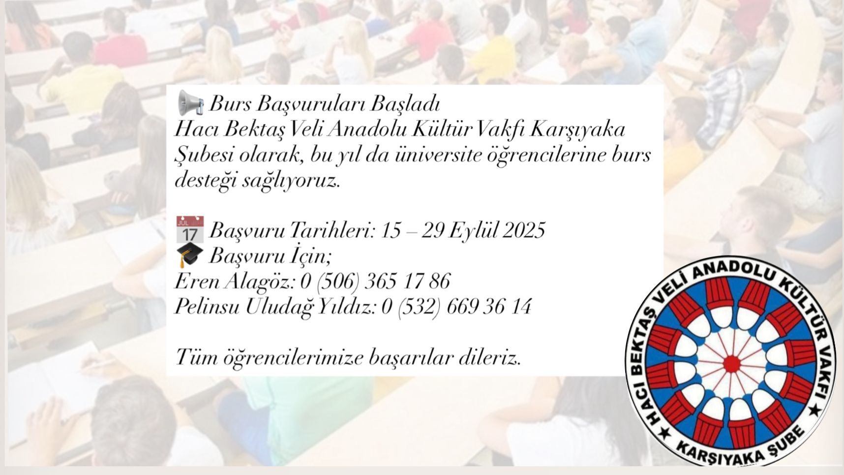 Hacı Bektaş Veli Anadolu Kültür Vakfı (HBVAKV) Karşıyaka Şubesi, her yıl olduğu gibi bu yıl da üniversite öğrencilerine eğitim desteği sağlamak amacıyla burs başvurularını başlattı. Maddi destekten faydalanmak isteyen öğrenciler, 15–29 Eylül 2025 tarihleri arasında başvurularını iletebilecek.