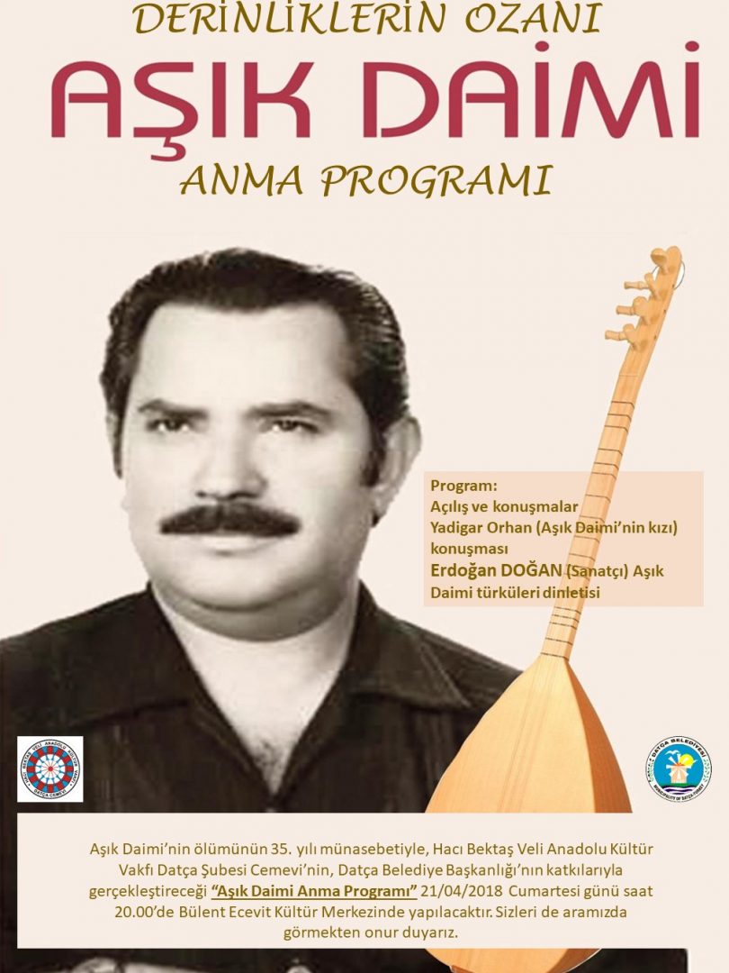 Hacı Bektaş Veli Anadolu Kültür Vakfı Datça Şubesi Cemevi, Bülent Ecevit Kültür Merkezi’nde Aşık Daimi’y’i anma etkinliği düzenleyecek. 21 Nisan Cumartesi günü saat 12.00’de Aşık Daimi Sokağı açılışıyla başlayacak. Saat 20.00’de ise konuşmalar ve Sanatçı Erdoğan Doğan’ın türküleriyle devam edecek. (HABER MERKEZİ)