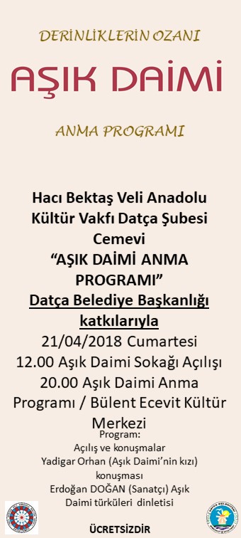 Hacı Bektaş Veli Anadolu Kültür Vakfı Datça Şubesi Cemevi, Bülent Ecevit Kültür Merkezi’nde Aşık Daimi’y’i anma etkinliği düzenleyecek. 21 Nisan Cumartesi günü saat 12.00’de Aşık Daimi Sokağı açılışıyla başlayacak. Saat 20.00’de ise konuşmalar ve Sanatçı Erdoğan Doğan’ın türküleriyle devam edecek. (HABER MERKEZİ)
