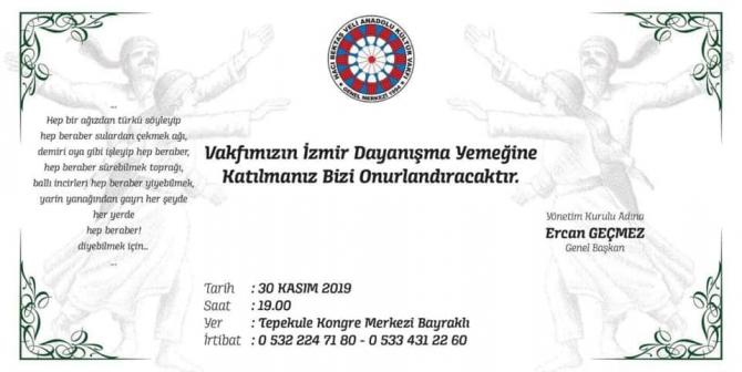 PİRHA – Hacı Bektaş Veli Anadolu Kültür Vakfı İzmir Şubesi’nin dayanışma yemeği 30 Kasım’da yapılacak.
