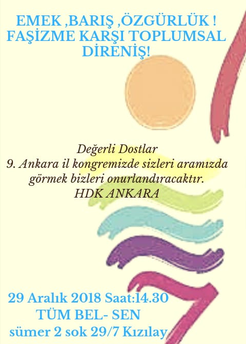 Halkların Demokratik Kongresi Ankara Şubesi, 29 Aralık’da kaongresini gerçekleştirecek. Tüm Bel -Sen’de yapılacak kongre ‘Emek, barış, özgürlük! Faşizme karşı toplumsal direniş’ sloganıyla yapılacak.