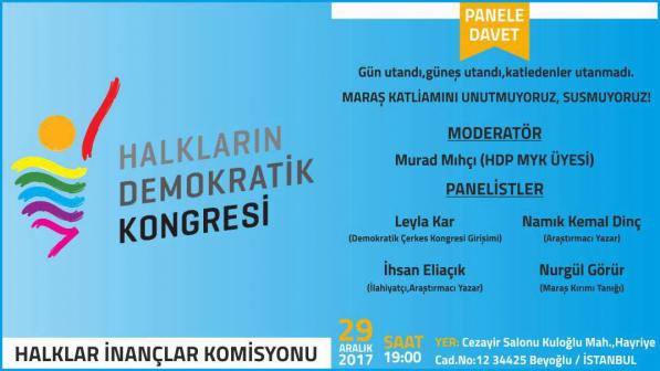 HDK Halklar ve İnançlar Komisyonu, “MARAŞ KATLİAMINI UNUTMUYORUZ, SUSMUYORUZ!” çağrısıyla İstanbul’da panel gerçekleştirecek.Bu akşam saat 19:00’da Beyoğlu Cezayir Salonu’nda gerçekleşecek olan panele katliamın tanığı Nurgül Görür, Demokratik Çerkes Kongresi Girişimi’nden Leyla Kar, İlahiyatçı-Yazar İhsan Eliaçık ve Araştırmacı-Yazar Namık Kemal Dinç konuşmacı olarak katılacak.