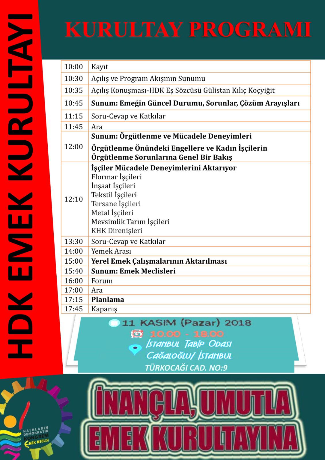 Halkların Demokratik Kongresi (HDK) Emek Meclisi “İnançla,umutla kurultaya” şiarıyla emek kurultayını gerçekleştirecek. İstanbul Cahaloğlu’nda bulunan tabip odası salonunda 11 Kasım Pazar günü saat:10:00 da başlayacak olan kurultay saat:18:00 kadar devam edecek.Yapılacak olan emek kurultayına HDK Eş Sözcüsü Gülistan Kılınç Koçyiğit katılacak.