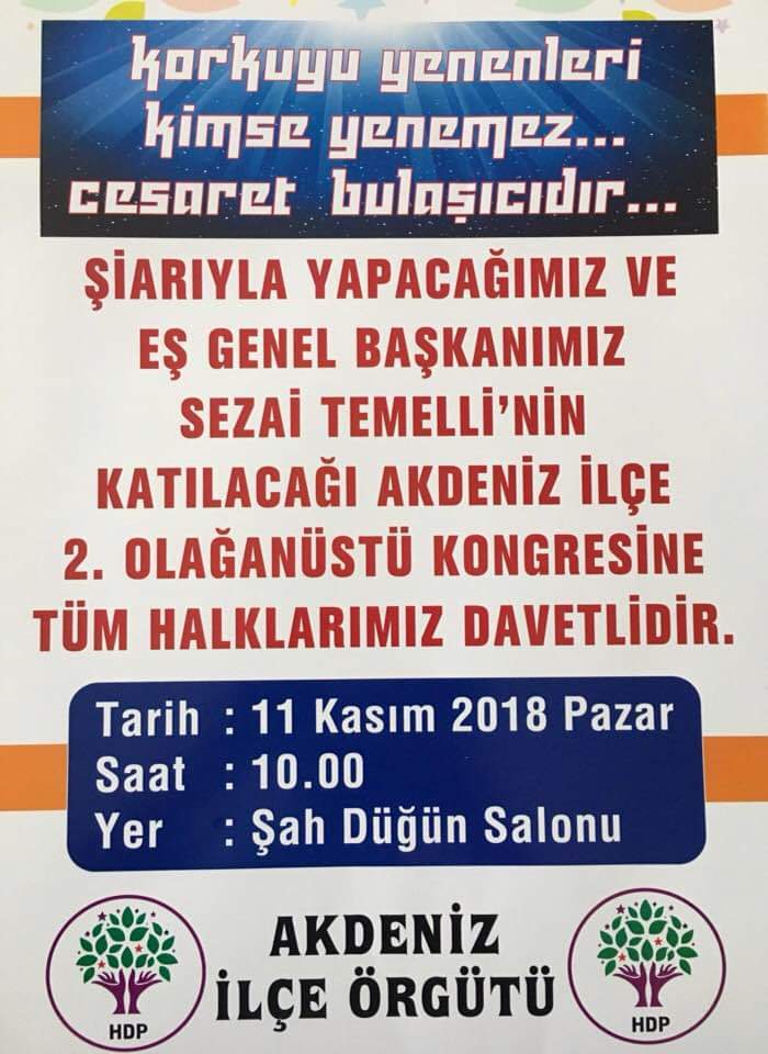 Halkların Demokratik Partisi (HDP) Akdeniz ilçe örgütü “Korkuyu yenenleri kimse yenemez cesaret bulaşıcıdır” şiarıyla 2’nci olağan kongresini gerçekleştirecek. 11 Kasım Pazar günü saat:10:00’da Şah salonda yapılacak olan kongreye HDP Eş Genel Başkanı Sezai Temelli, Mersin il ve ilçe örgütleri Eş Başkanları katılacak.