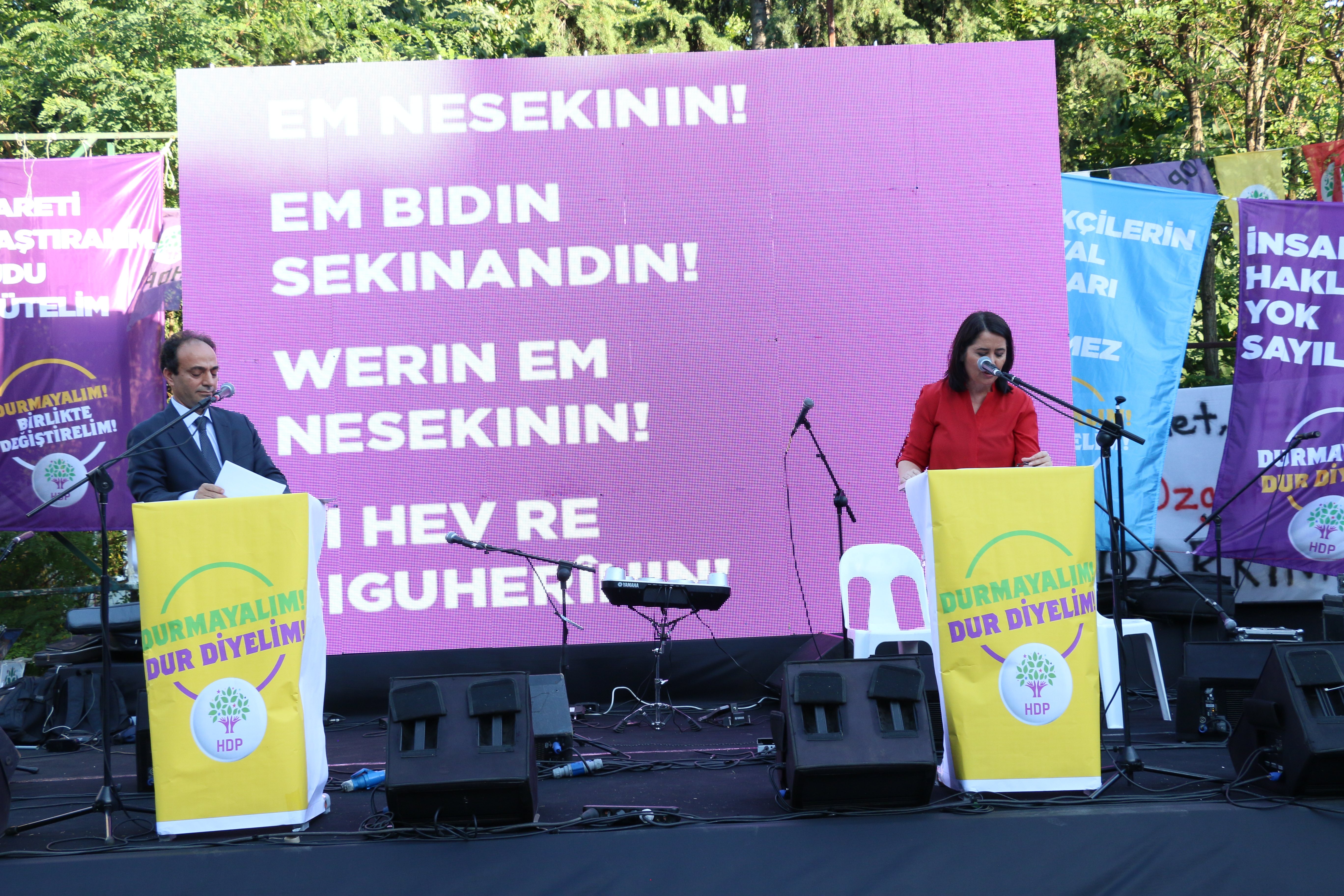 Halkların Demokratik Partisi (HDP), Beşiktaş’ta bulunan Abbasağa Parkı’nda “Durmayalım, Dur diyelim” sloganıyla düzenlediği ‘Demokrasi Mitingi’nde “Ortak mücadeleye çağırıyoruz” başlıklı “Demokratik Çözüm Deklarasyonu”nu açıkladı.