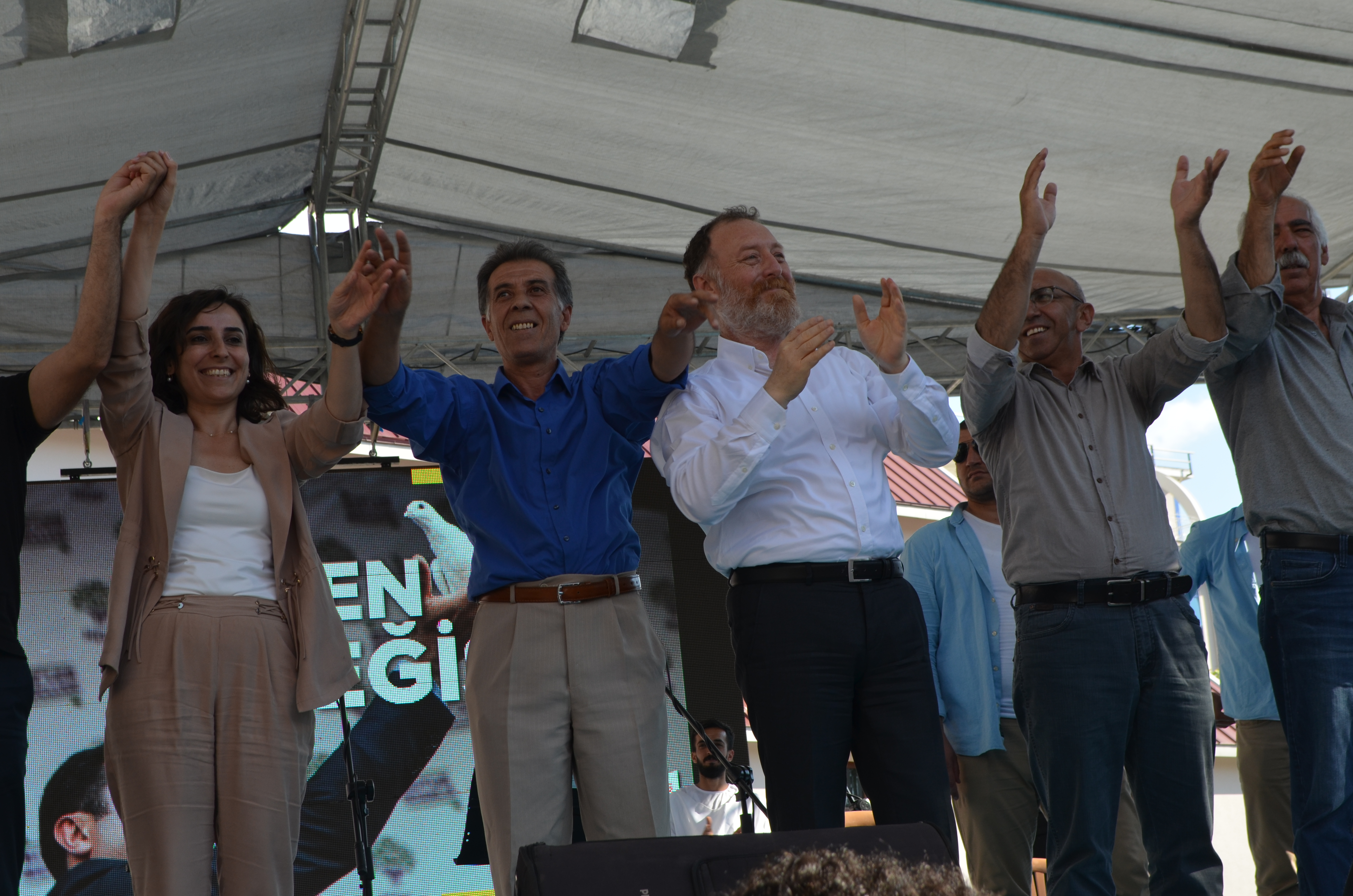 Temelli’nin konuşmasının ardından sahneye çağrılan HDP Dersim milletvekili adayları Meral Hanbayat ve Alican Önlü, Mazgirt Belediye Başkanı Tekin Türkel, Ovacık Belediye Başkanı Fatih Maçoğlu, ESP Temsilcisİ Ali Ekber Kaya ile birlikte Temmeli’i kitleyi selamladı.