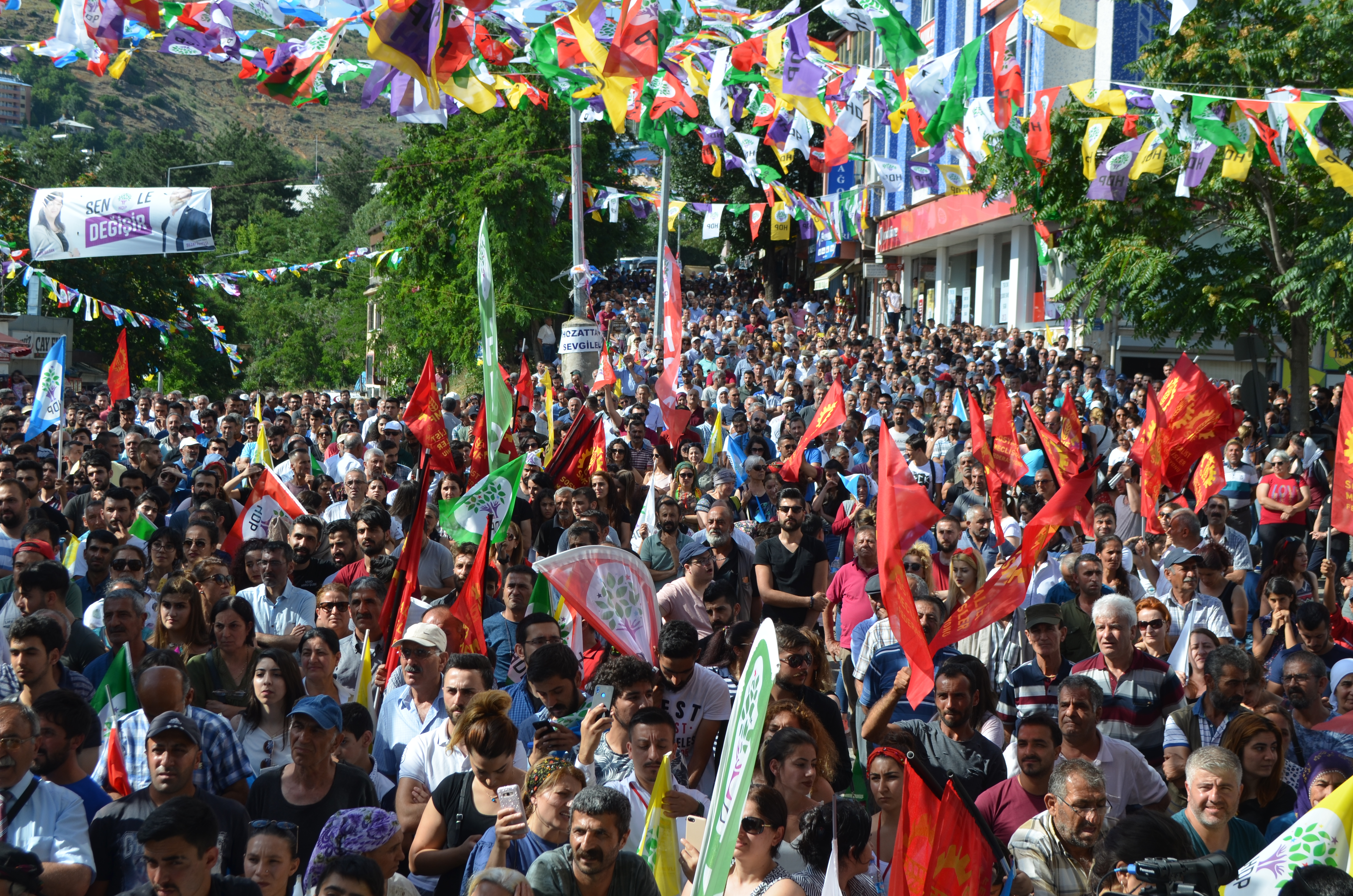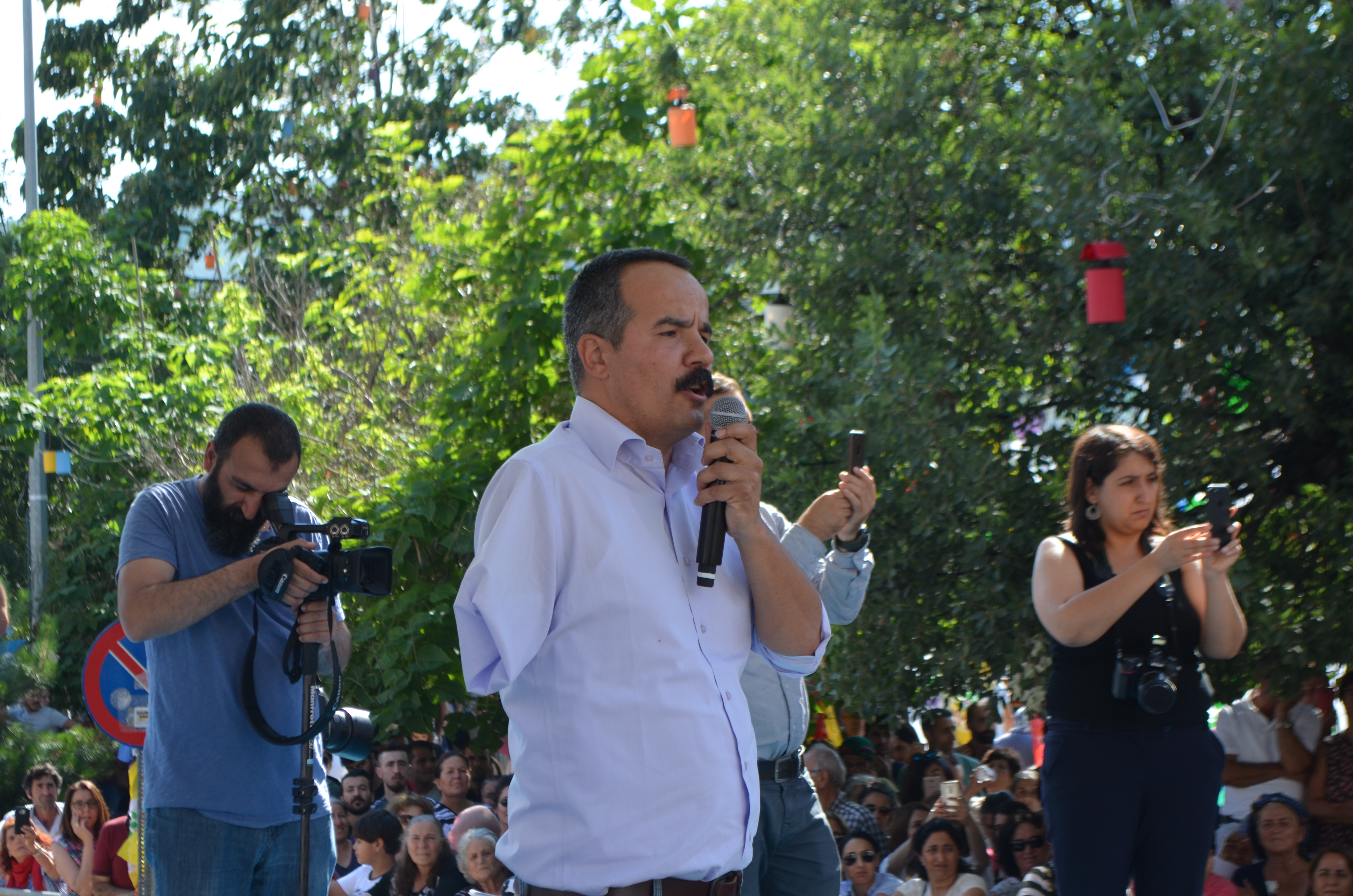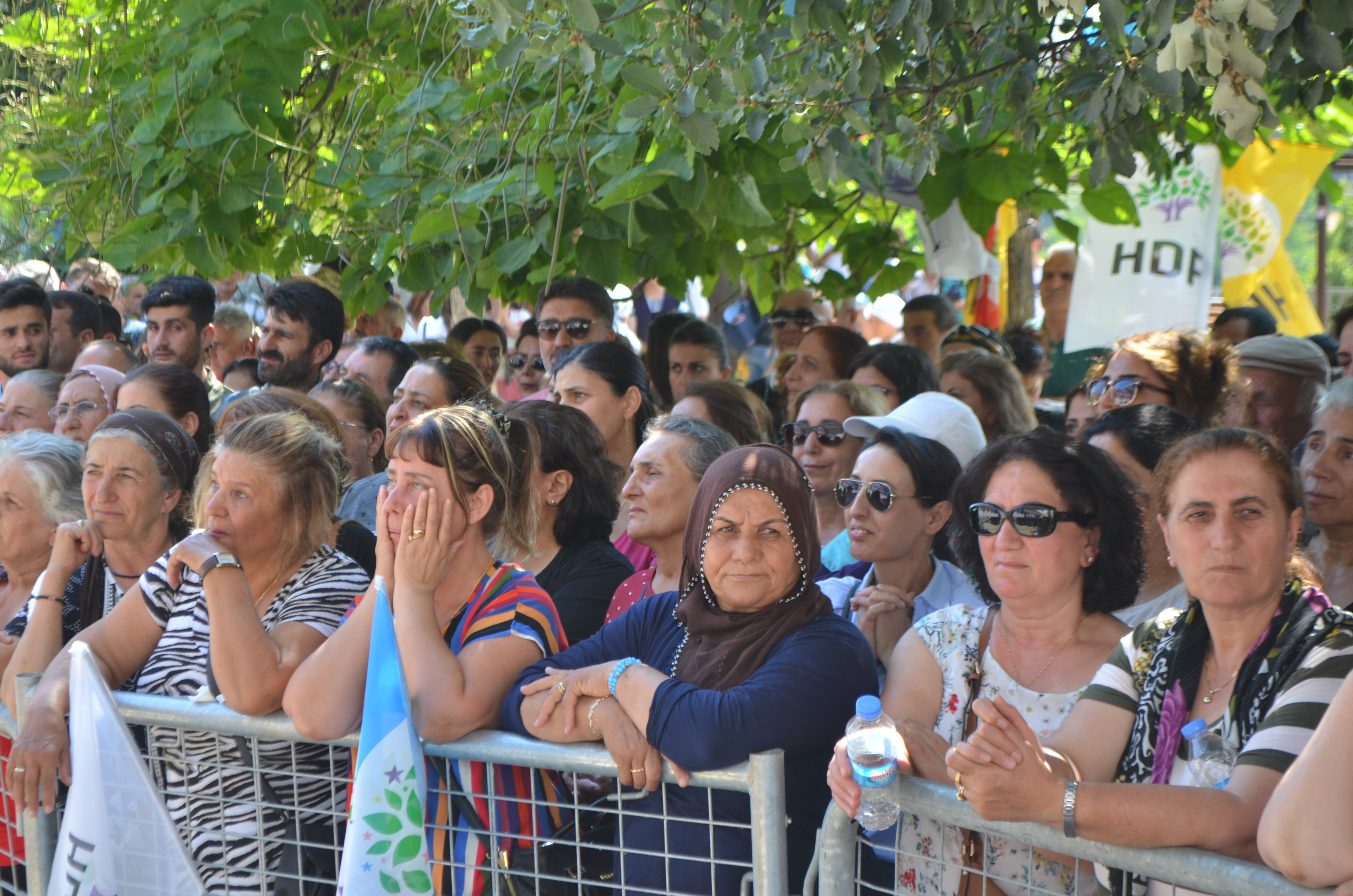 “Bunun için birinci turda bir oy HDP’ye bir oy Demirtaş’a. İkinci turda ise ya Erdoğan rejimi ya da demokrasi diyeceğiz. Ülkedeki sorunların çözüm yolu çünkü demokrasidir. Gelin eşit yurttaşlık temelinde bir anayasa yapalım. Bizim sözümüz budur. Bu Alevilerin, Ermenilerin, Süryanilerin, bu topraklarda yaşayan 73 milletin sözüdür.25 Haziran’da hep birlikte umudun halayına duracağız. Bir arada yaşamanın, çoğulcu yaşamın iradesini göstereceğiz. Erdoğan’ın bu ülkeye en büyük vaadi OHAL rejimi. Her türlü yasağı ve şiddeti halkın üzerinden uyguluyor. Sandıkta AKP gidecek. Valiler, kaymakamlar, emniyet müdürleri AKP’nin kampanyasını yürüterek, suç işliyor. Bunu yapmamalı halka hizmet etmeliler.”