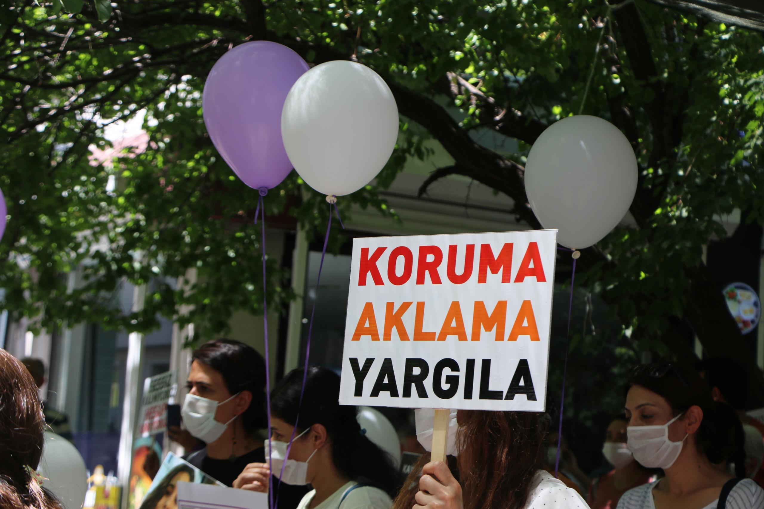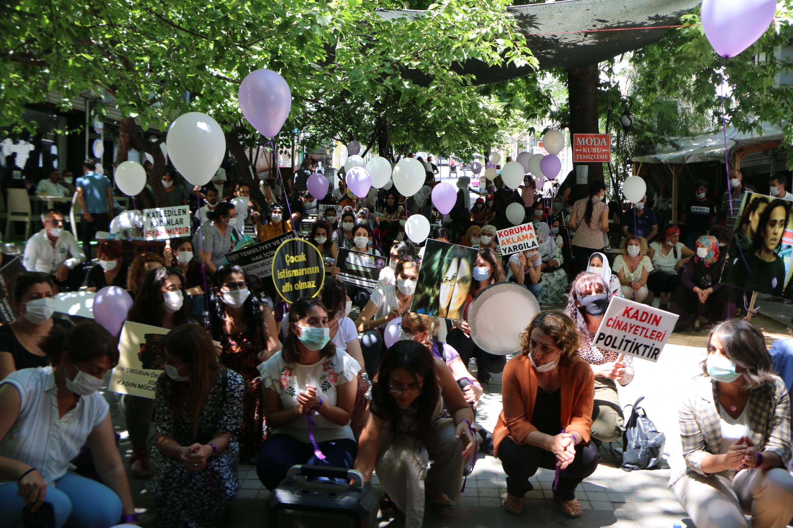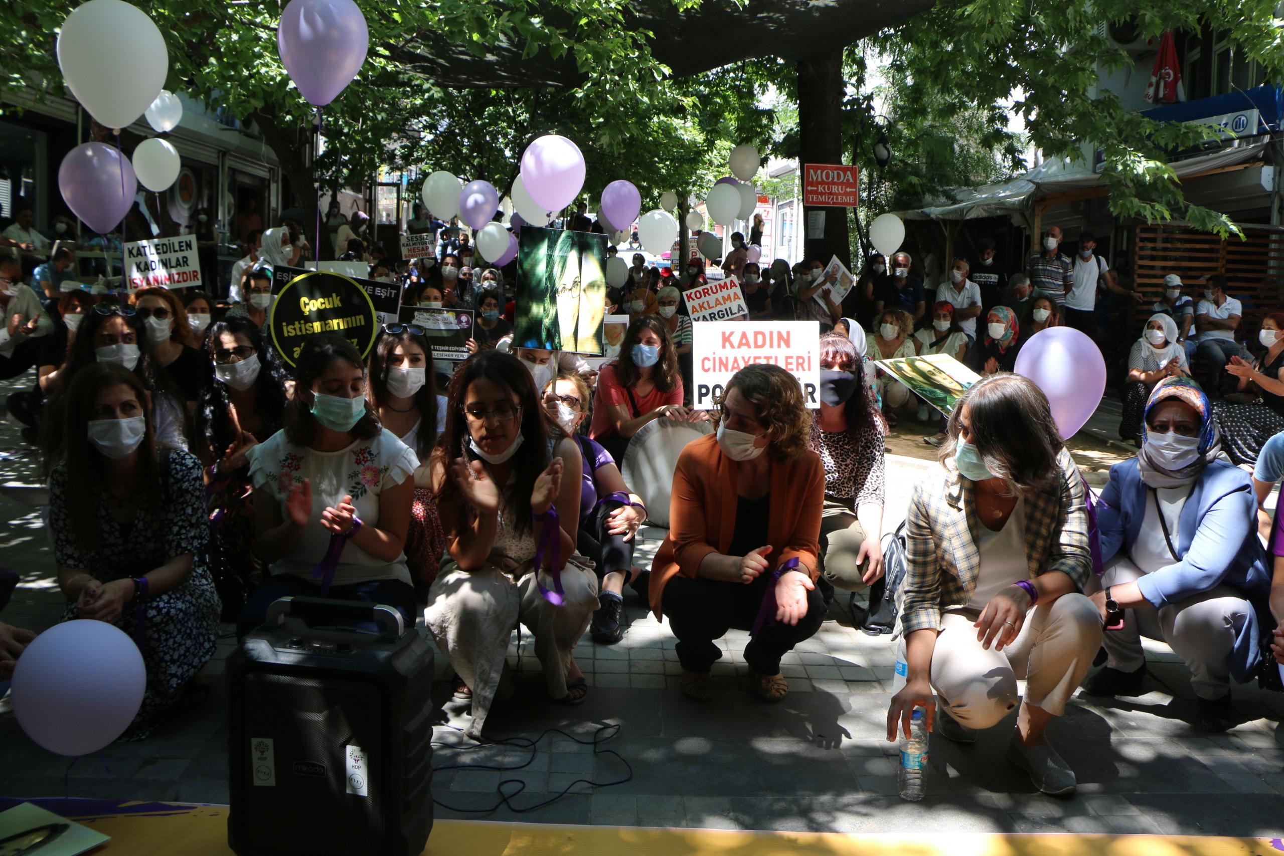 Açıklamanın ardından oturma eylemi yapılarak müzik eşliğinde halaylar çekildi. Son olarak kadınlar, mor ve beyaz renkli balonları uçurdu.