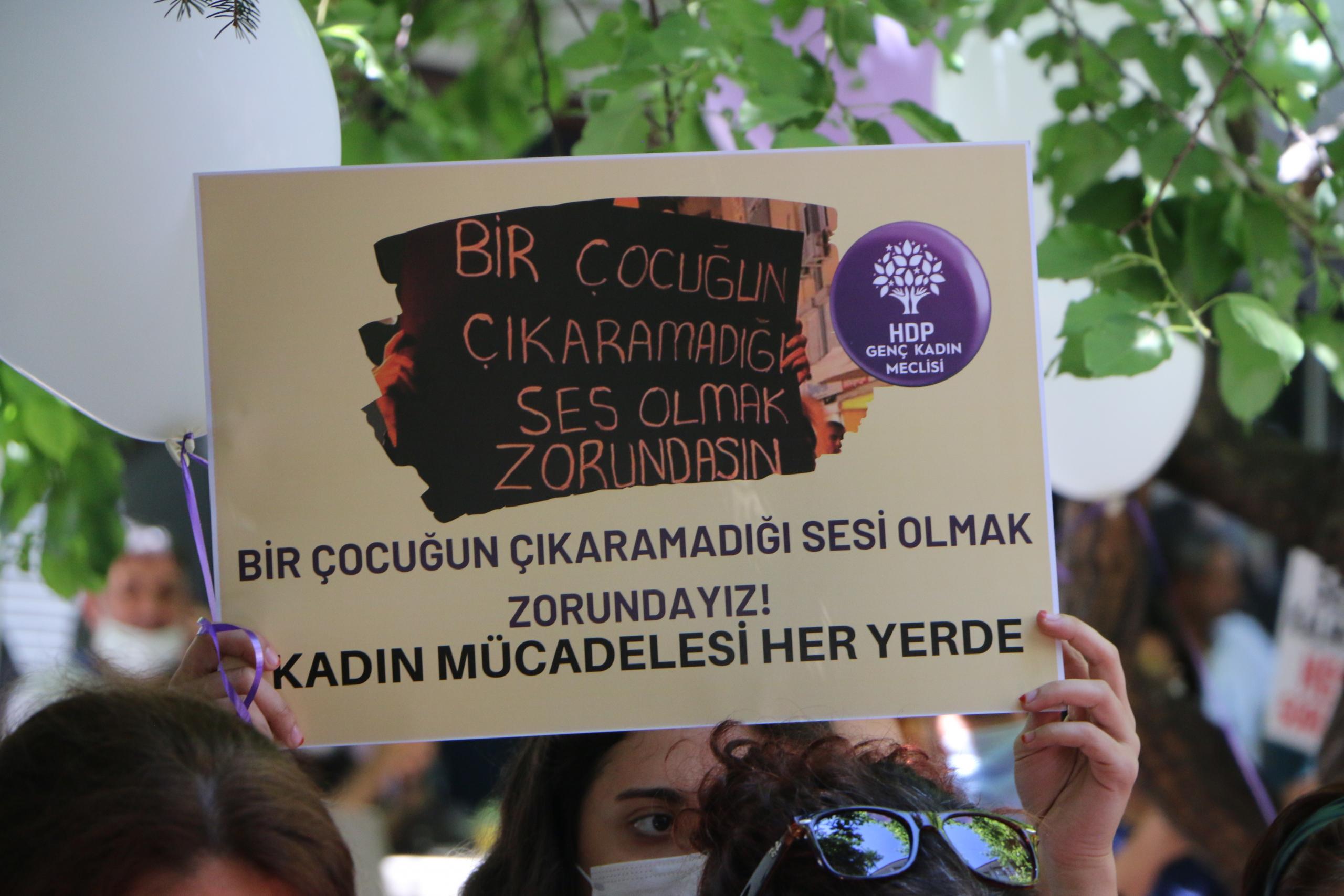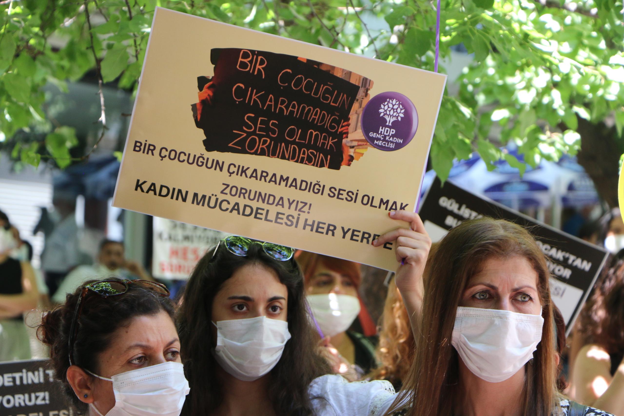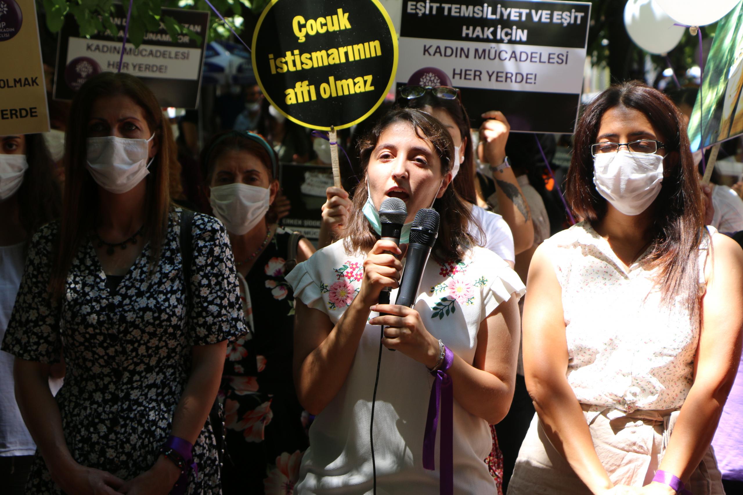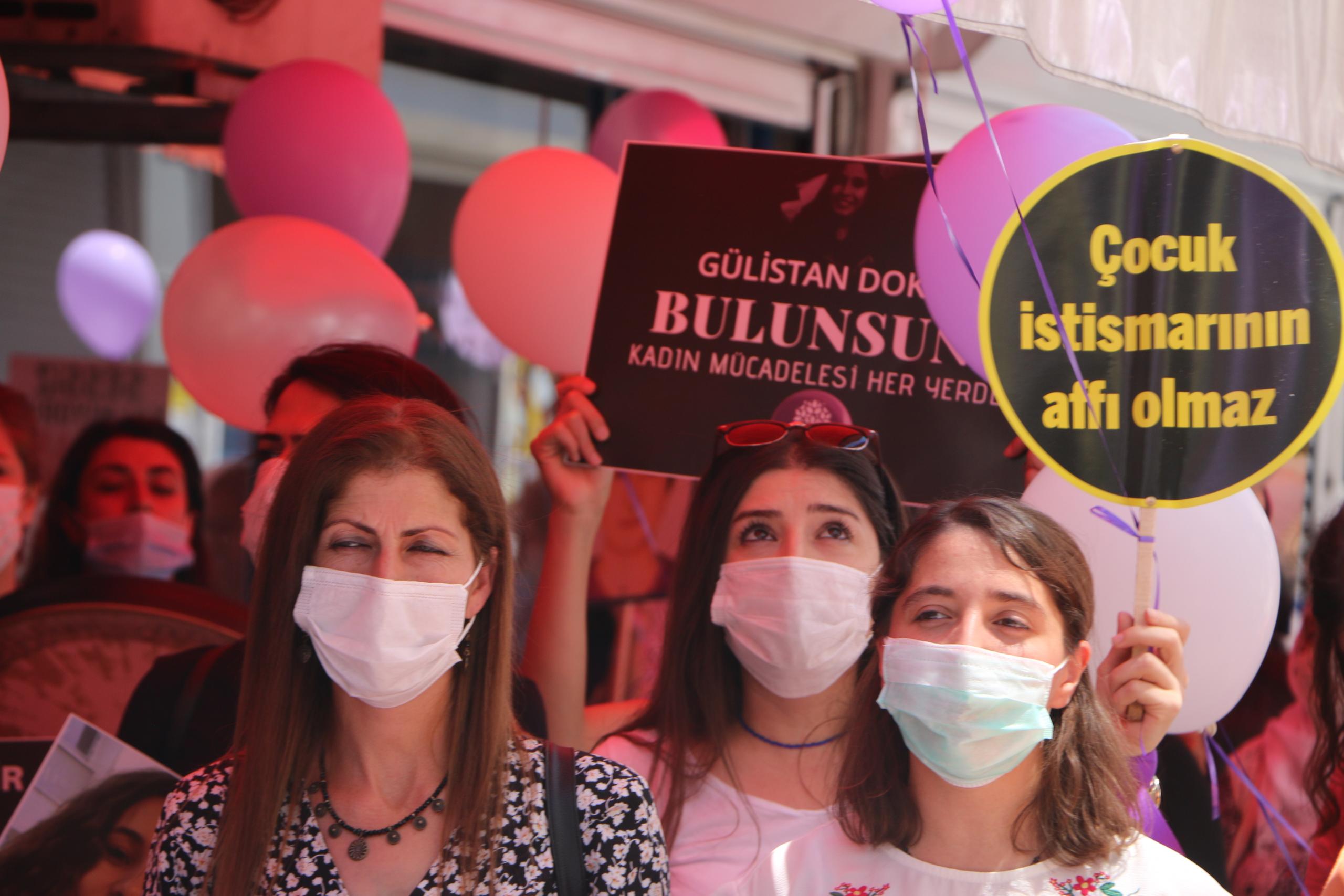 Eylemde “Jin jiyan azadî”, “Hepimiz birer Gülistanız”, “Kadın cinayetleri politiktir”, “İstismar affına hayır”, ”İstismarı aklama aklattırma” sloganları atıldı.