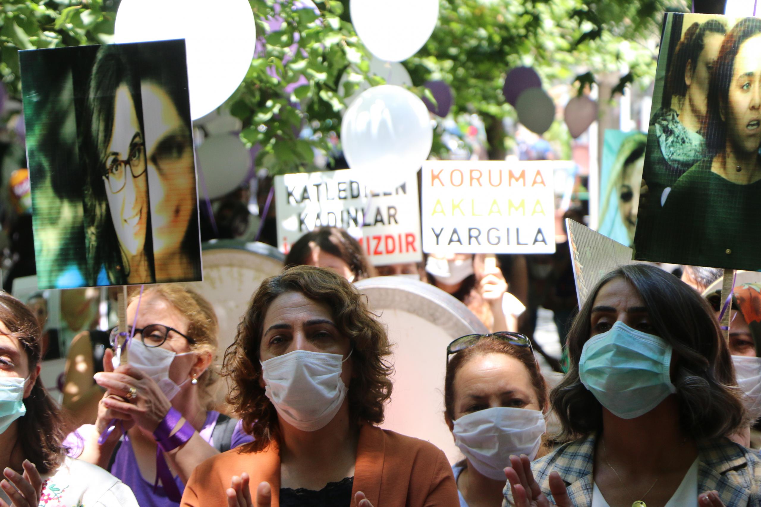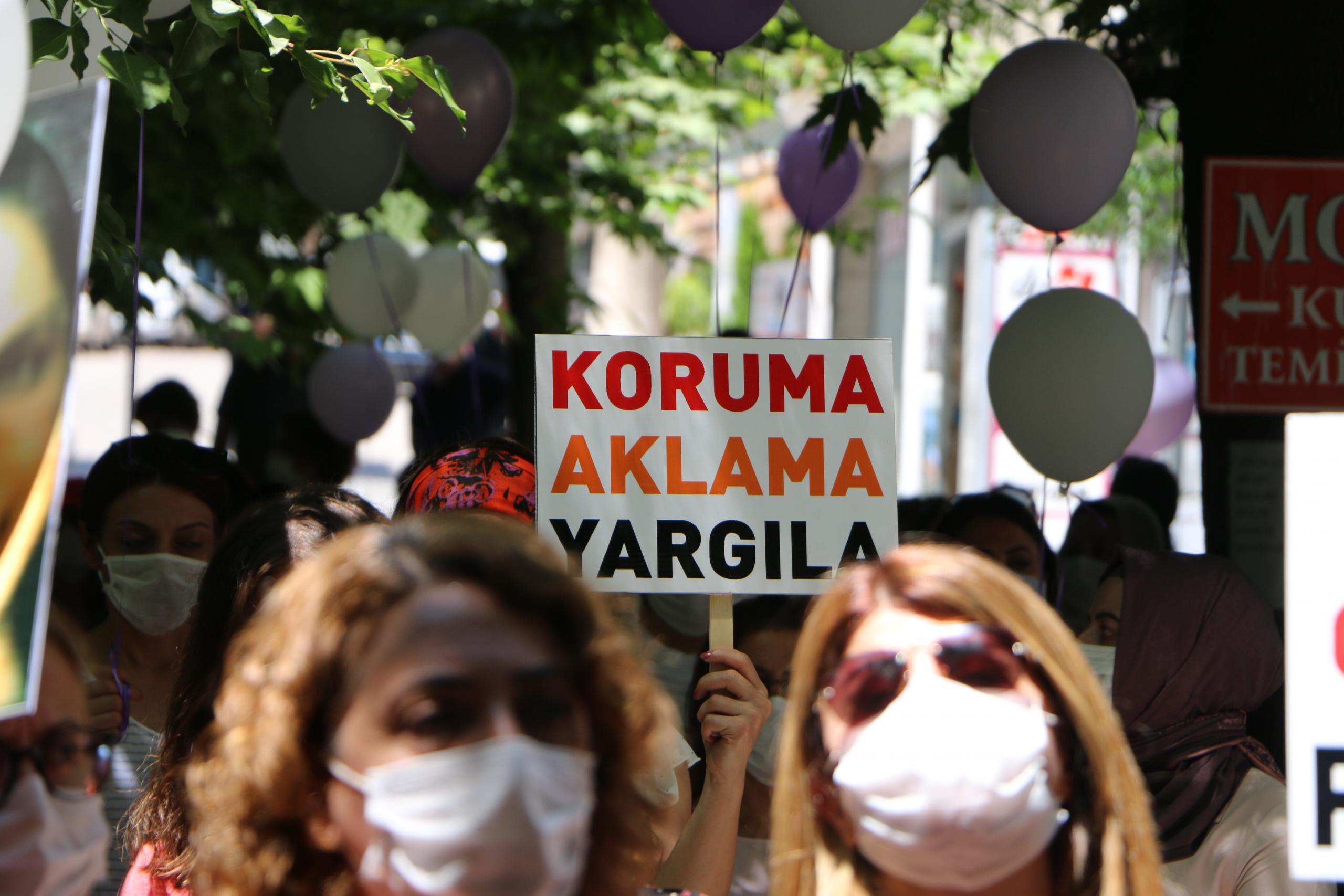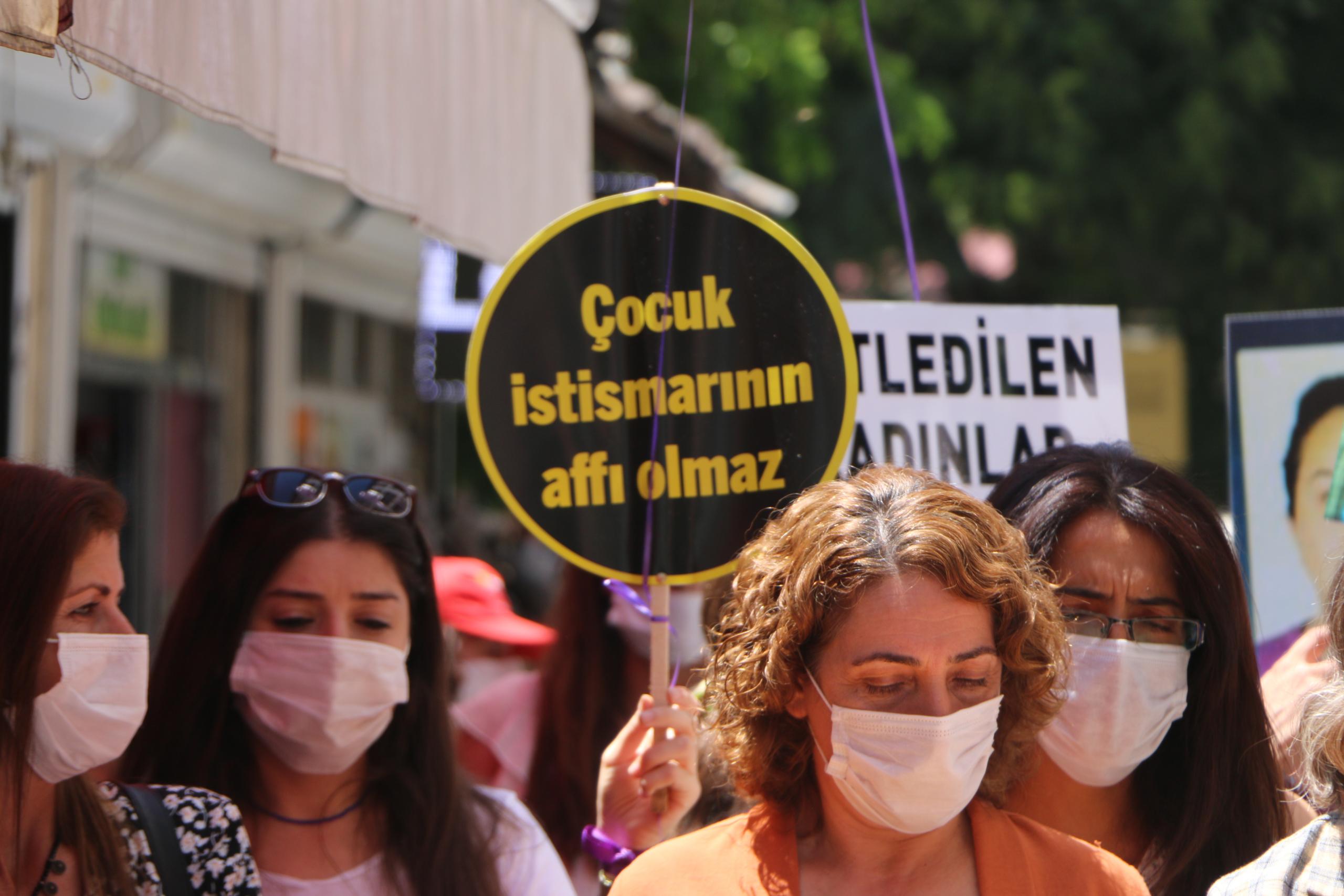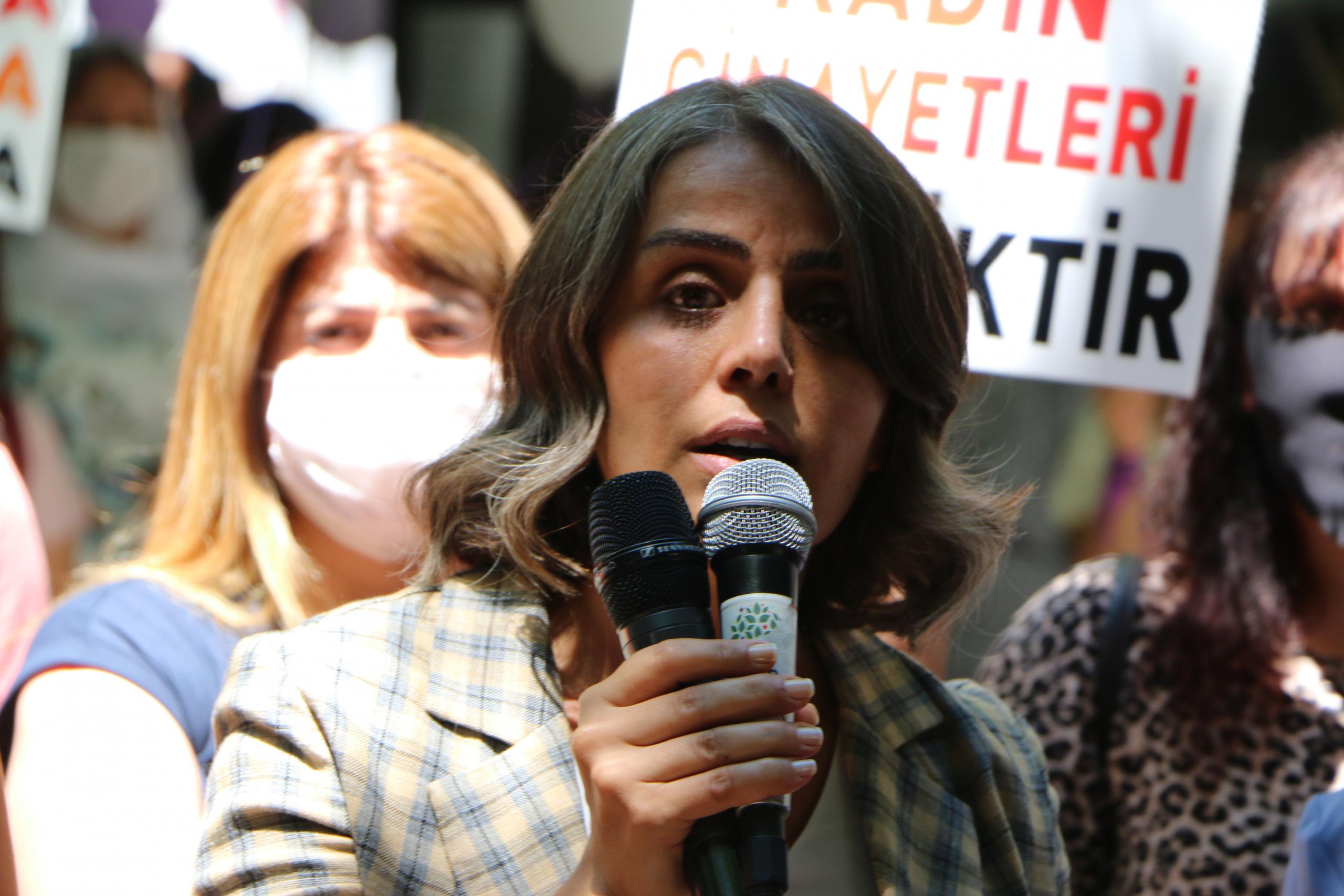 Eylemde “Jin jiyan azadî”, “Hepimiz birer Gülistanız”, “Kadın cinayetleri politiktir”, “İstismar affına hayır”, ”İstismarı aklama aklattırma” sloganları atıldı.