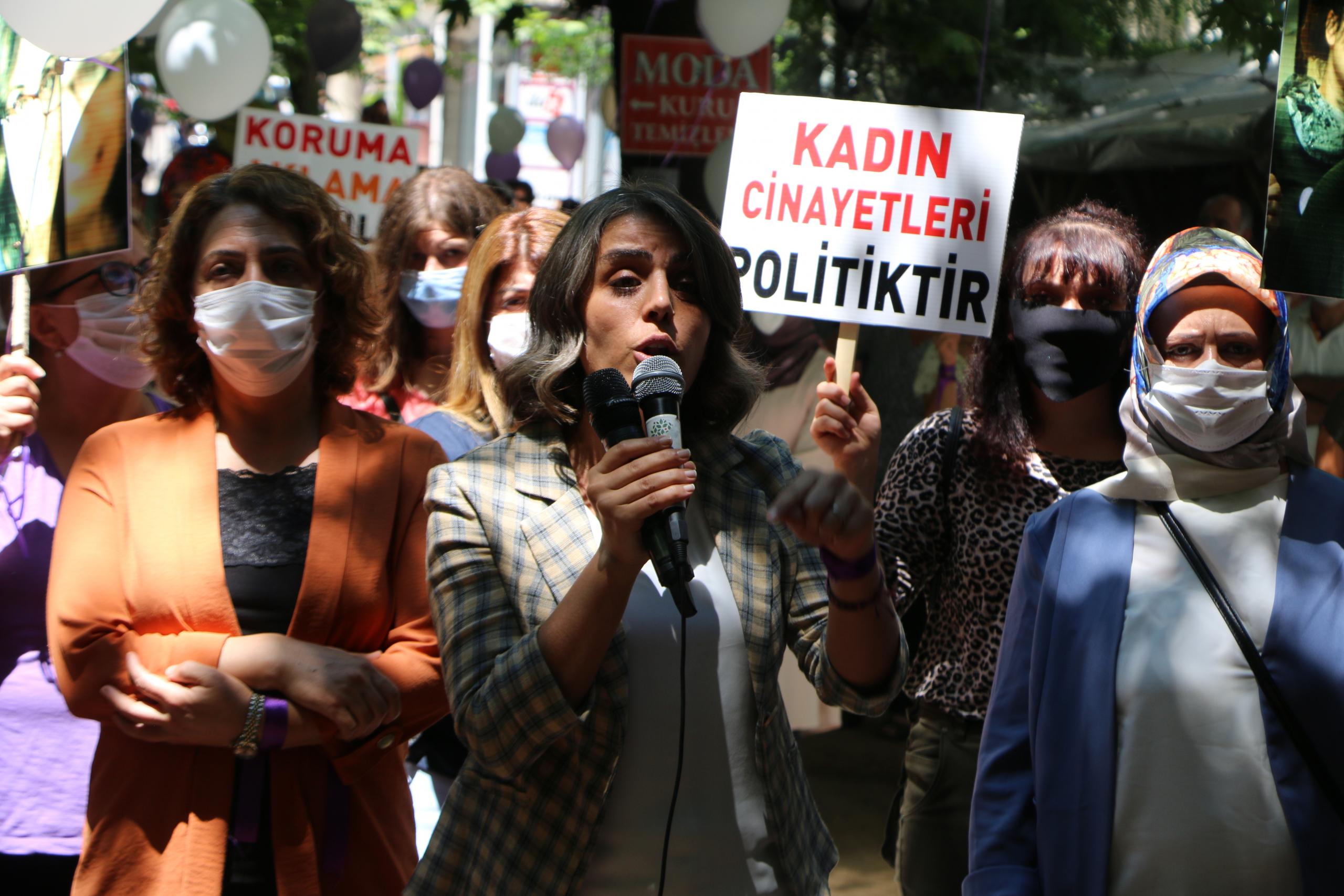 Eylemde ilk olarak konuşan HDP Diyarbakır Milletvekili Dersim Dağ, iktidarların kadına yönelik politikalarına dikkat çekti. “ Bizim belirlediğimiz sınırlarda bizim istediğimiz gibi yaşayacaksınız” diyen Dağ, eril zihniyetin her yere sirayet ettiğini dile getirdi. Kadının rengi ülkede hakim olana kadar mücadele edeceklerini ifade eden Dağ, “‘Gülistan Doku Nerede? Melek’in katilleri kim? diye sormaya devam edeceğiz. Genç kadınlar politikalarınıza boyun eğmeyecek. Bu mücadele gün be gün büyüyecek. Eril zihniyet kaybedecek, kadın mücadelesi kazanacak” dedi.