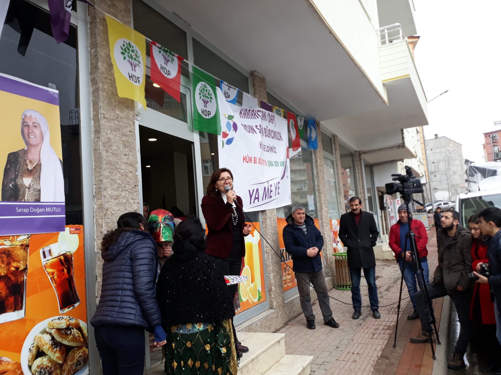 Açılışta konuşan Serap Doğan Mutlu, “Sevgili kadınlar, 31 Mart yerel seçimleri hem halkımız hem de kadınlar için tarihi bir fırsat niteliğindedir. Çünkü bu sıradan bir seçim olmayacaktır. 2014 seçimlerinde büyük bir çoğunlukla kazandığımız 103 belediyemiz iktidar tarafından gasp edilmiştir. Halkın iradesi yok sayılmıştır. Belediye başkanlarımız hırsızlık yapmadı, yolsuzluk yapmadı, halkın emeğini sömürmedi, Belediye eş başkanlarımız yüzyıllardır halkımıza yapılmayan hizmetleri yaptı, kültürel, tarihsel değerlerimize sahip çıktı” ifadelerini kullandı.