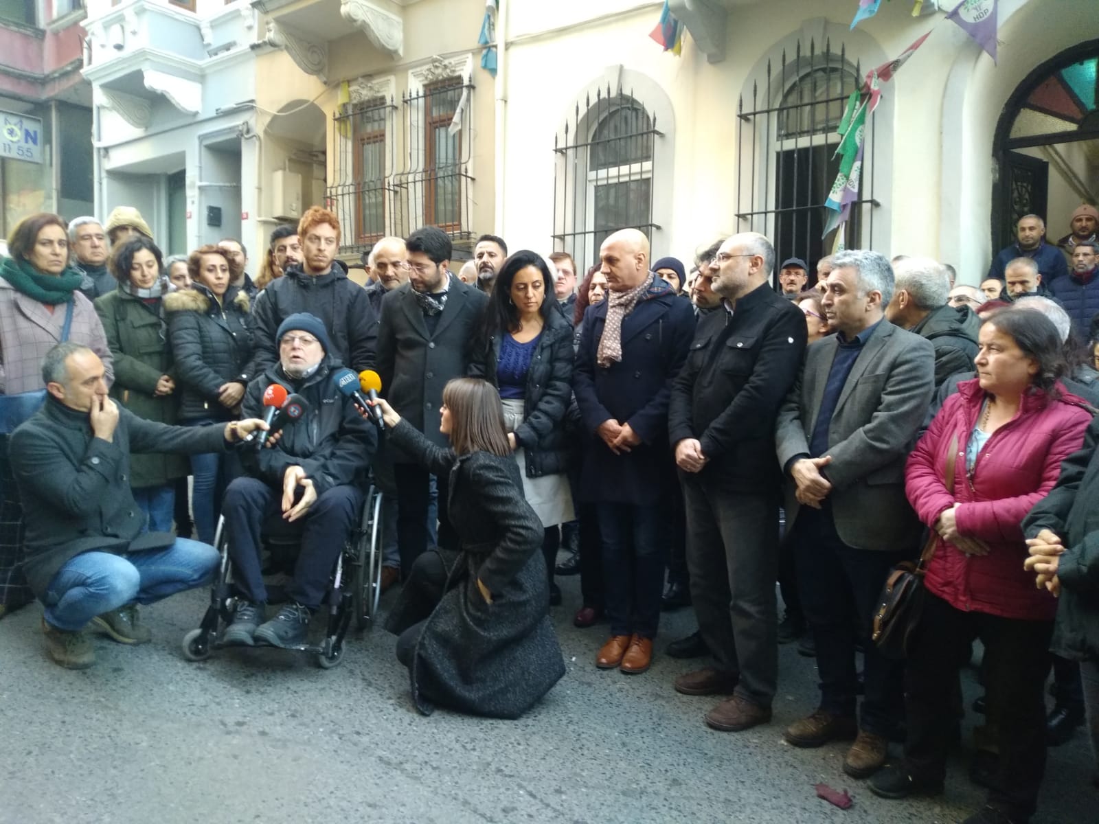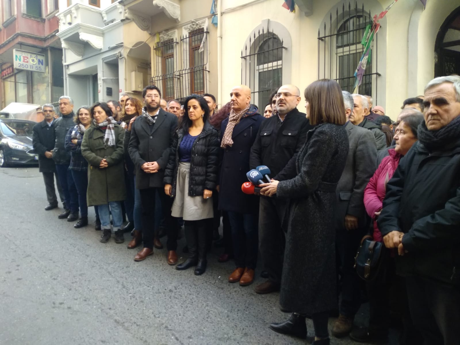 HDP İstanbul İl binası önünde yapılan açıklamaya İstanbul İl Eş Başkanları Elif Bulut, Erdal Avcı, HDP Milletvekili Musa Piroğlu, partinin il, ilçe üyeleri çok sayıda yurttaş katıldı. Açıklamada sık sık “Baskılar bizi yıldıramaz” ve “Faşizme karşı omuz omuza” sloganları atıldı.