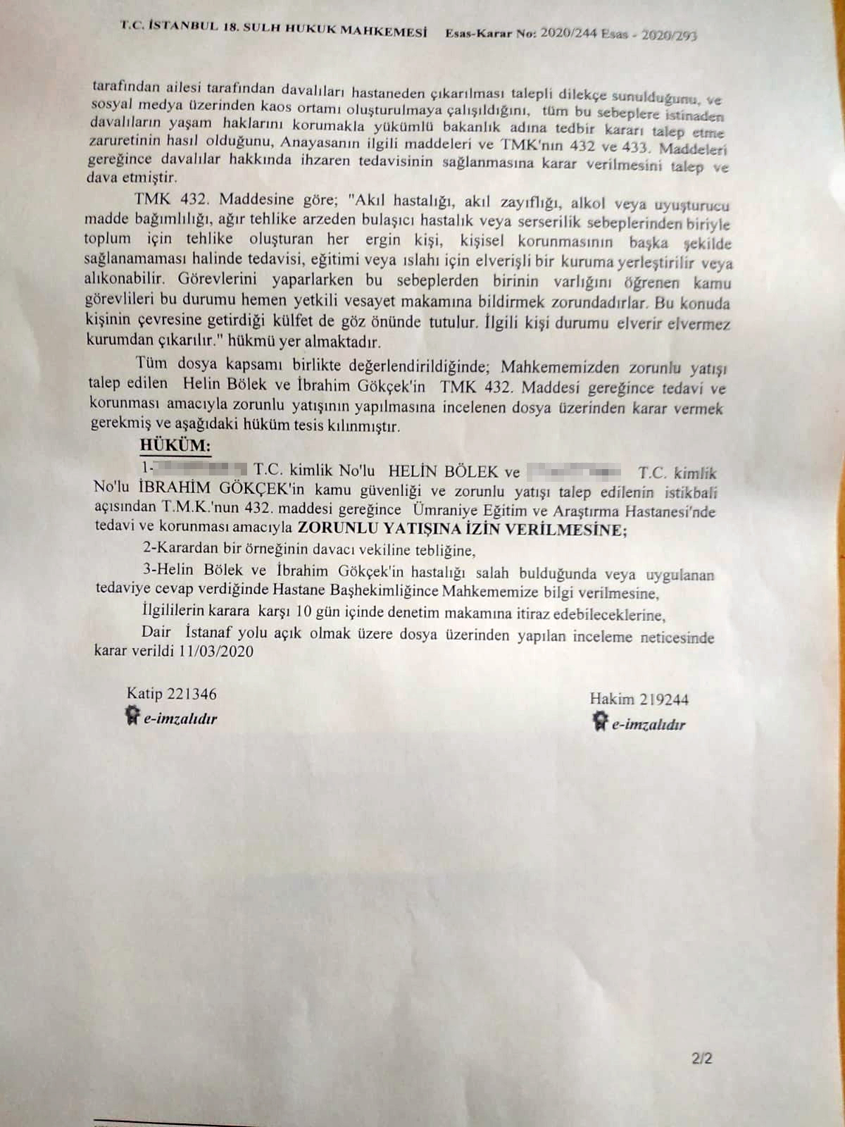 Bölek ve Gökçek’in avukatları, ”18. Sulh Hukuk Hakimliği, müvekkillerimiz İbrahim Gökçek ve Helin Bölek’in Sağlık Bakanlığı’nın talebi üzerine zorunlu yatışına karar verdi” açıklaması yaptı.