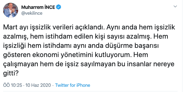 “Aynı anda hem işsizlik azalmış, hem istihdam edilen kişi sayısı azalmış” diyen Muharrem İnce, “Hem işsizliği hem istihdamı aynı anda düşürme başarısı gösteren ekonomi yönetimini kutluyorum. Hem çalışmayan hem de işsiz sayılmayan bu insanlar nereye gitti?” dedi.