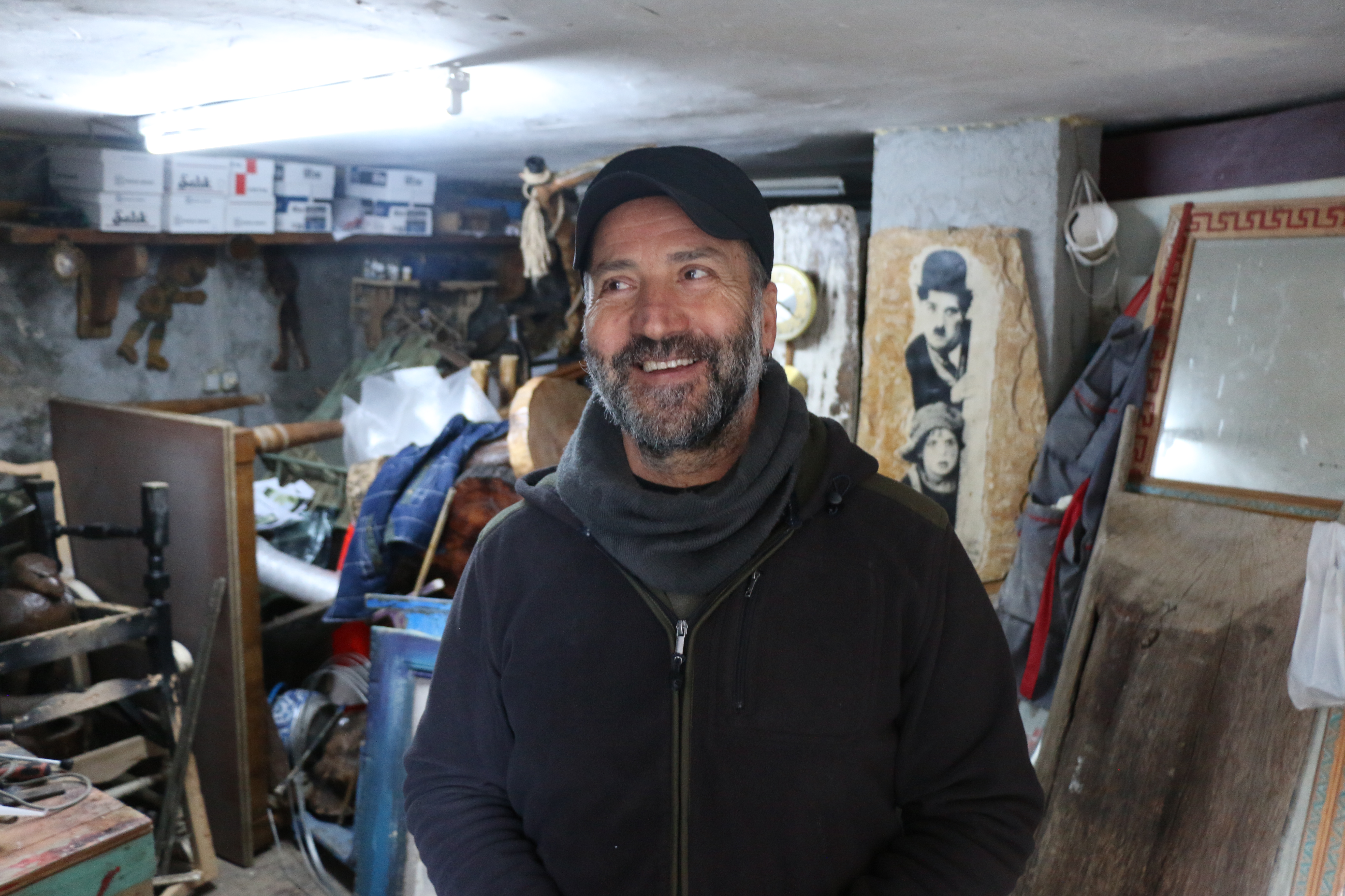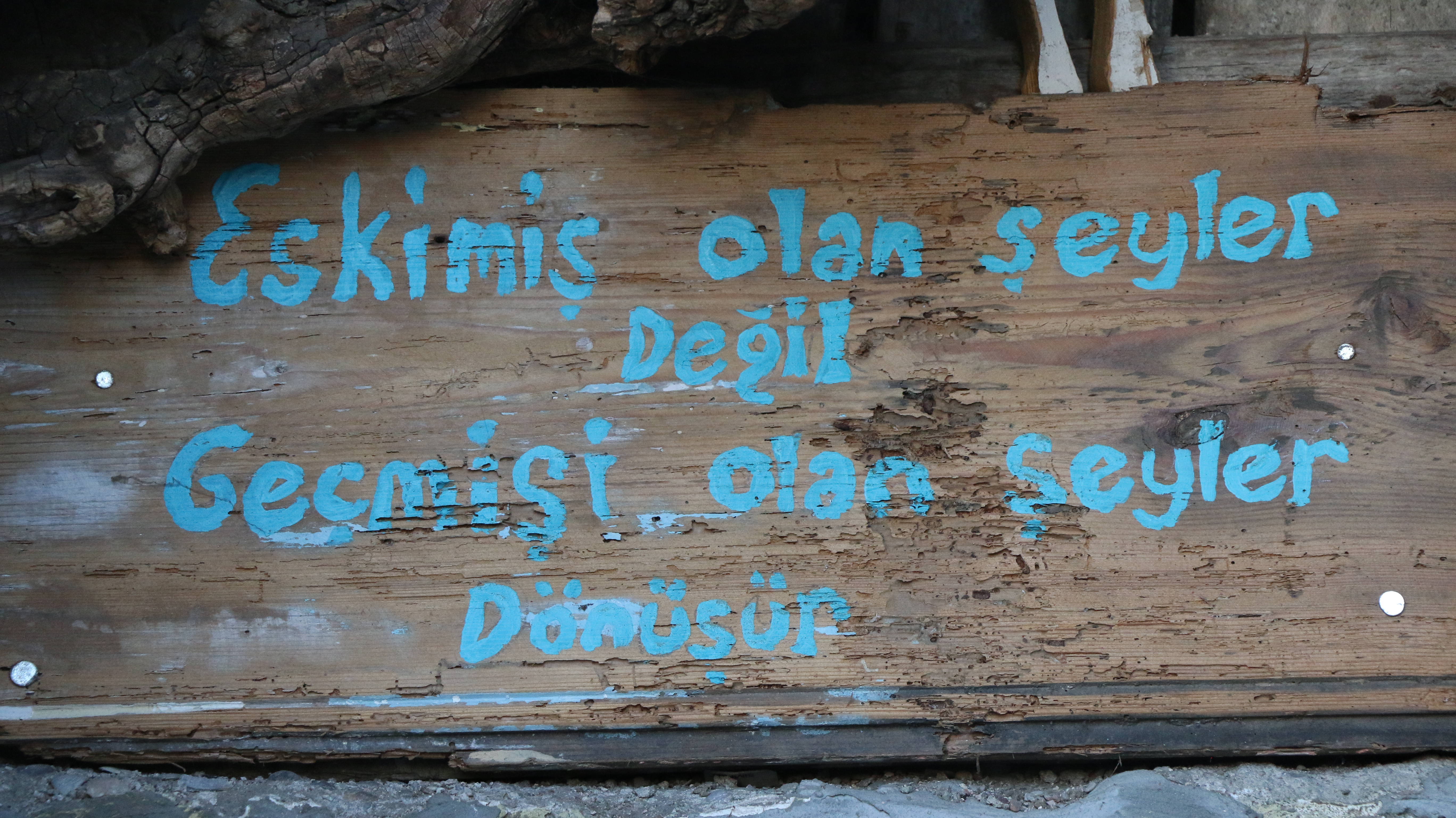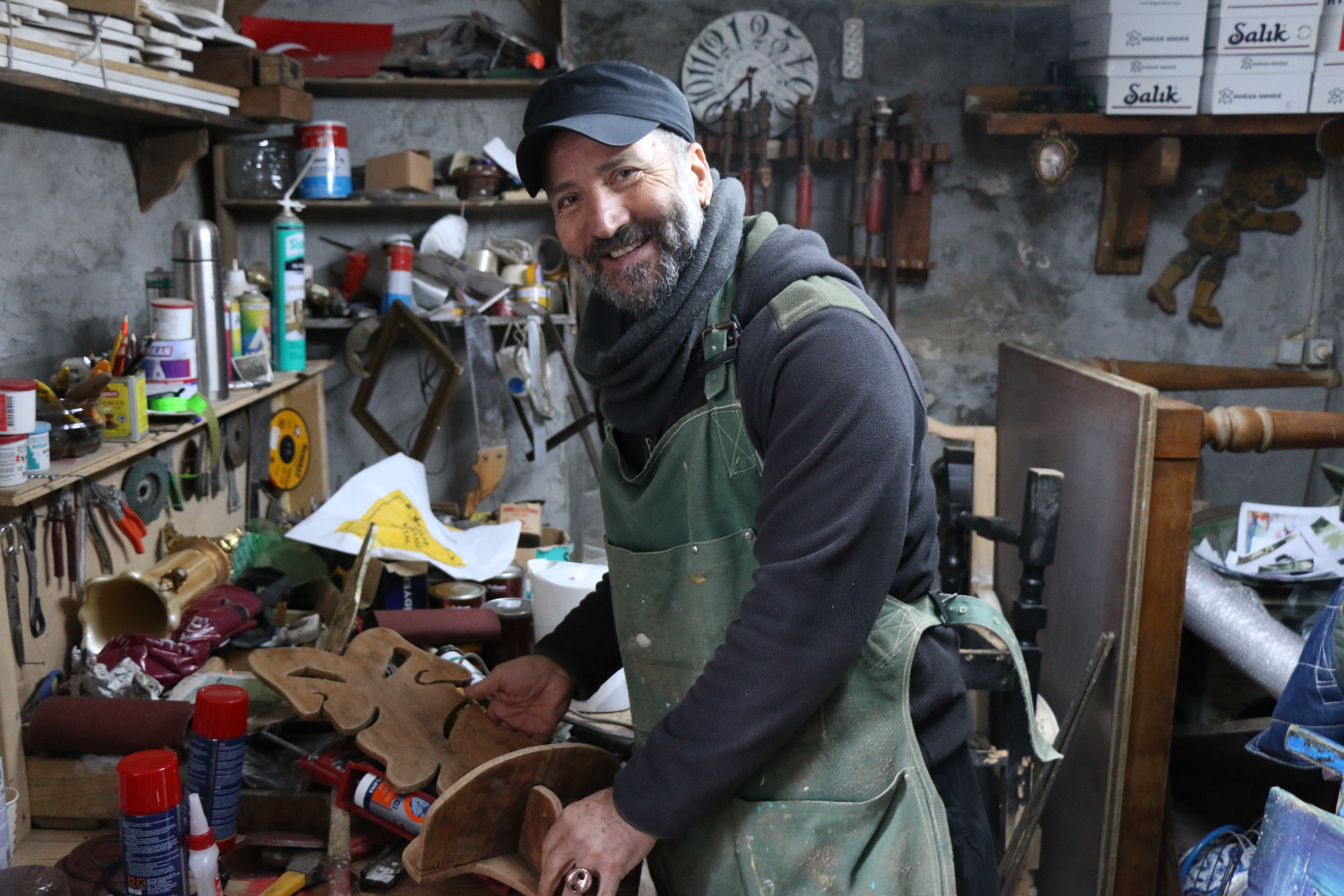 Eski ahşapların olduğu atölye de tarihi bir mekan. Bir hurdacının yakmak için götürdüğü çift kanatlı bir kapı şimdilerde atölyeyi örtüyor. Mehmet usta, “Ben kapıyı alarak tasarlayıp, dönüştürüp üzerindeki kurtları ve eskiliği atıp onardım. Sonra öğrendim ki bu kapı burada onlarca yıl görevini yapmış tarihi Molla Aşki Camii’nin bir kapısı. O kapıyı şu an atölyemde çift kanat kapısı olarak kullanıyorum” diyor.