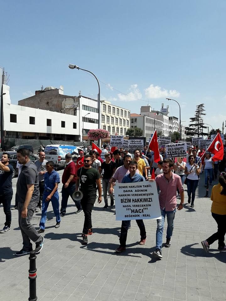 Mevlana Kültür Merkezi önünde toplanan işçiler Zafer Meydanı’na sloganlarla yürüyüş yaptı. Kitlesel olarak yapılan yürüyüşte, Beğendik, Real ve Metro logolu dövizlerle birlikte “Haklarımızı gasp ettirmeyeceğiz” pankartı ile yaklaşık 2 kilometre yol yüründükten sonra işçiler adına Hasan Duymaz basın açıklaması yaptı. Konuşmasında Real Market’in nasıl iflas noktasına getirildiğini anlattı.