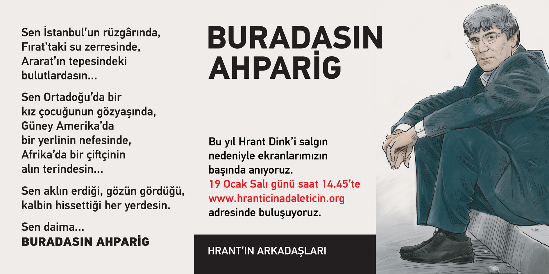 Hrant’ın Arkadaşları da her yıl 19 Ocak’ta yapılan Hrant Dink anmasının bu yıl pandemi nedeniyle Salı günü, saat 14.45’te http://hranticinadaleticin.org adresinde çevrimiçi yapılacağını duyurmuştu.