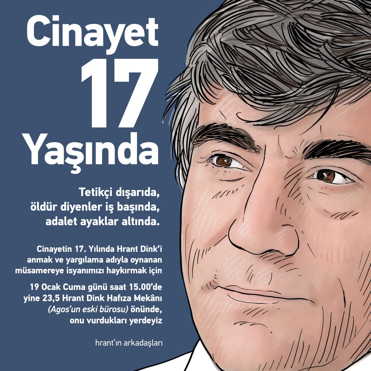 Yan yana, daha çoğalarak daha yüksek sesle isyanımızı dile getirmek ve cinayetin 17. yılında Hrant Dink’i anmak için 19 Ocak Cuma günü saat 15.00’te, 23,5 Hafıza Mekanı (eski Agos bürosu) önünde, onu vurdukları yerdeyiz.”