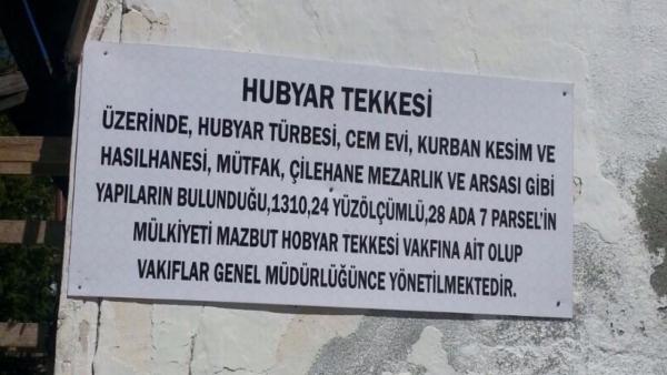 Tekke Vakıflar Genel Müdürlüğü uhdesine geçer geçmez kapısına Hubyar Tekkesi “Vakıflar Genel Müdürlüğünce Yönetilmektedir” tabelası asılmıştı. Köylülerin ve Hubyar Vakfı’nın mücadelesi sonucu tabela yerinden sökülmüştü. (TK)